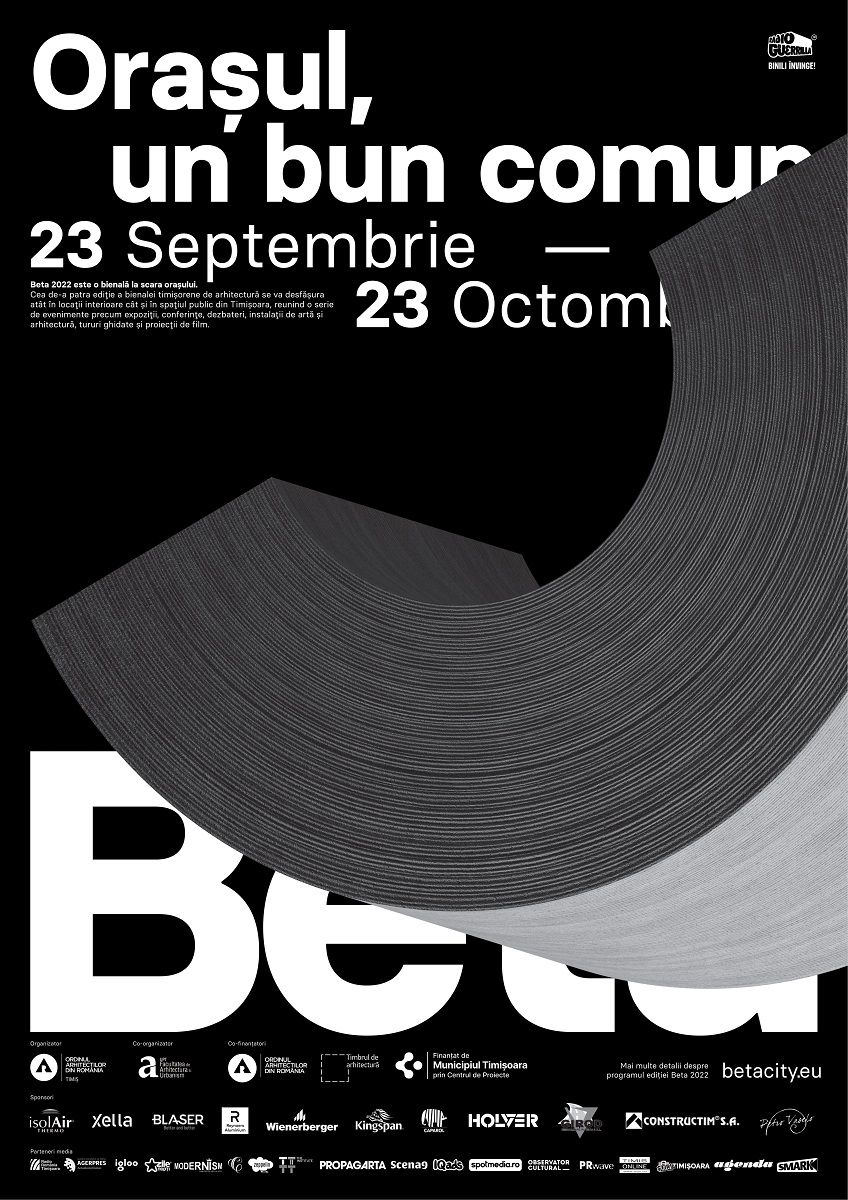 Cea de-a patra ediție a Bienalei Timișorene de arhitectură – Beta 2022 se va deschide oficial în data de 23 septembrie, ora 18:30, în Piața Romanilor nr. 1, și se va desfășura în perioada 23 septembrie – 23 octombrie 2022. Bienala deschide discuția despre Oraș ca fiind un bun comun, în încercarea de a investiga relația fiecăruia dintre noi cu spațiul urban. Organizată de Ordinul Arhitecților din România, Filiala Teritorială Timiș și Facultatea de Arhitectură din Timișoara, Beta 2022 vine cu o serie de instrumente prin care încurajează publicul să fie un actor activ în spațiul urban și să își recâștige, în mod responsabil, dreptul la oraș.
