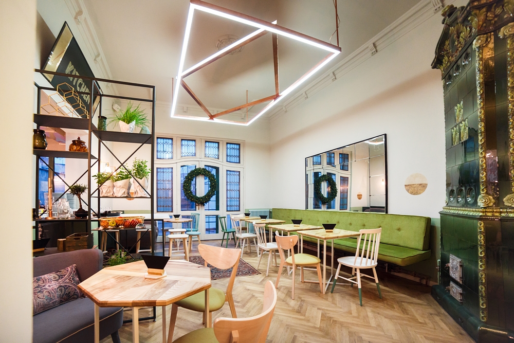 Reabilitarea casei a început în primăvara anului 2014 și a fost implementată de biroul de arhitectură SYAA, sub coordonarea Elizei Yokina. Spațiul vorbește despre ‘simbioză’ - între funcțional și estetic, între elementele vechi de design și cele moderne, urbane, între mobilierul proiectat și produs special pentru Simbio și elementele vintage recuperate chiar de către echipa barului. Eliza povestește despre primul contact cu spațiul liniștit, frumos, întunecat, cu lumină verde, cu sobe afumate și mobilier greu: "A fost un moment pe care nu aș putea să-l uit. Casa avea deja spațiile ei bine definite: salonul cu luminator, salonul cu soba verde, camera mică, camera mare, scara, demisolul cu boltișoare de cărămidă. A fost evident de la început că barul va fi la demisol, restaurantul cu show-kitchen la parter și zona de lucru la mansardă. Am vrut de la început să păstrăm și să aducem în lumină lucrurile valoroase, iar acolo unde era necesar să venim în completare cu finisaje cât se poate de apropiate de epoca în care a fost construită casa.”