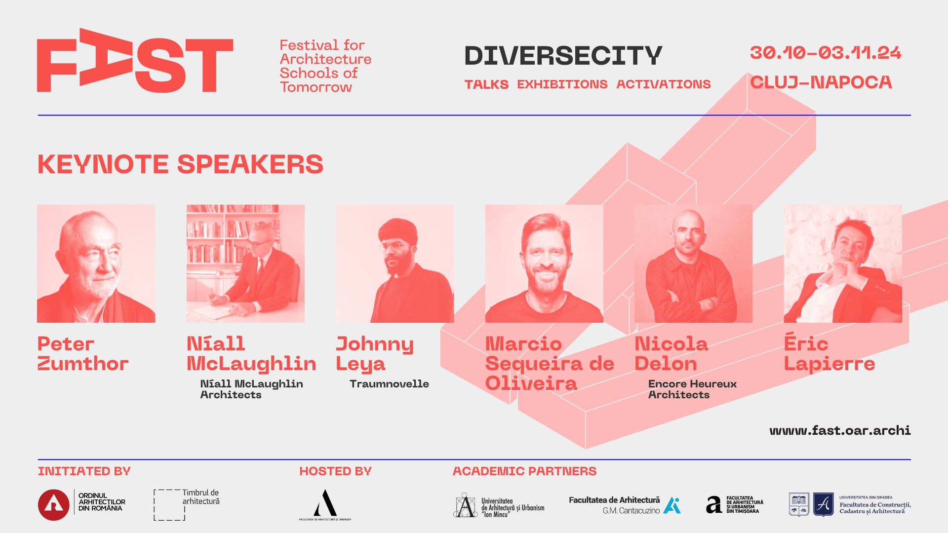 În mai puțin de 2 săptămâni, Cluj-Napoca devine pentru 5 zile capitala arhitecților și a tuturor celor interesați de viitorul orașelor noastre. FAST: Festival for Architecture Schools of Tomorrow, primul festival românesc dedicat viitorului arhitecturii, are loc între 30 octombrie și 3 noiembrie la Cluj-Napoca, cu participarea unor nume de prim rang în arhitectura mondială și a comunității profesionale din țară și din regiune. Urmează 5 zile de conferințe-eveniment, expoziții, proiecții de film, activări, concerte, tururi de arhitectură și ateliere în care explorăm tematica ediției: d i v e r s e c i t y , diversitatea fenomenelor care afectează orașele prezentului și oportunitățile pentru viitor.