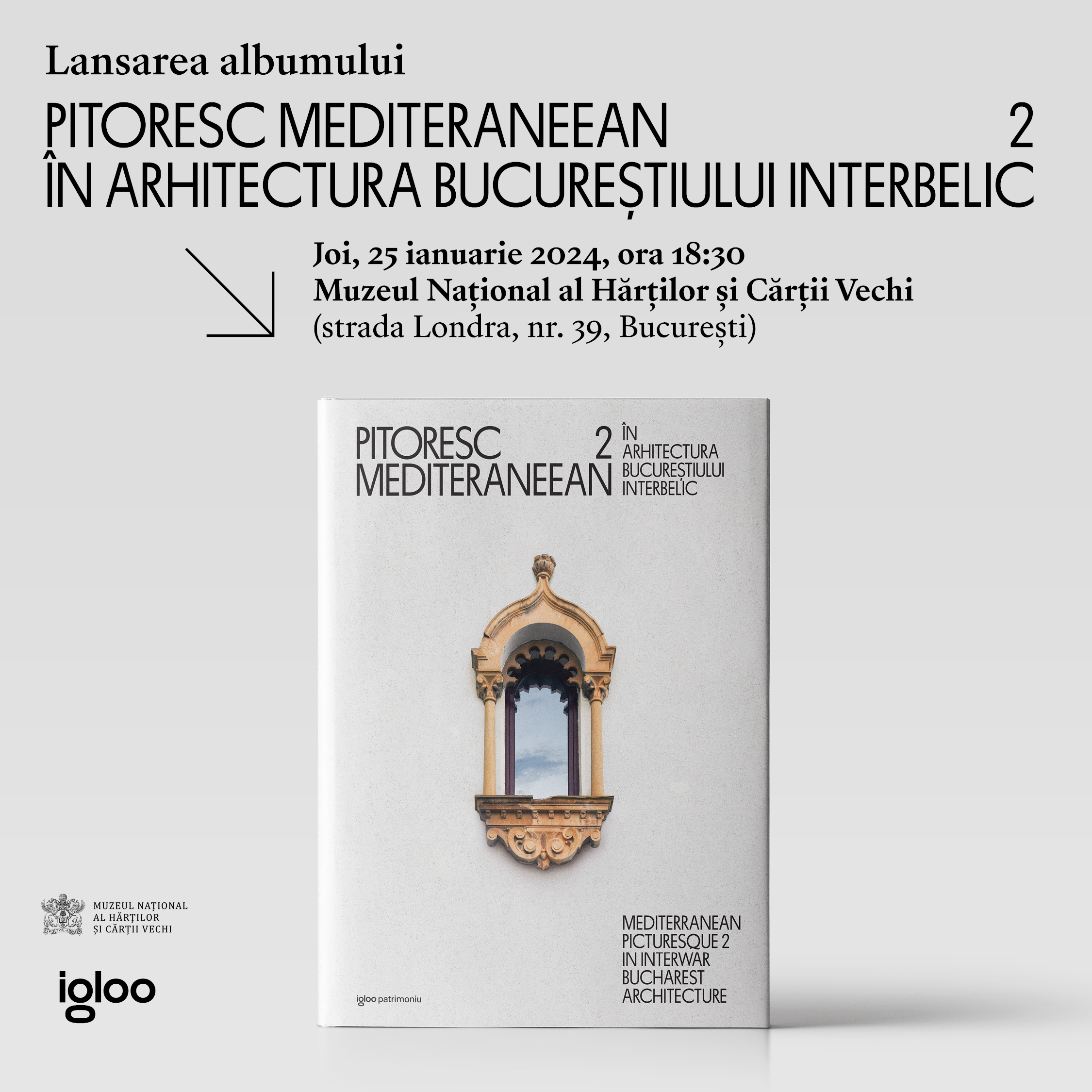 Igloo media anunță lansarea albumului Pitoresc mediteraneean în arhitectura Bucureștiului interbelic II, joi, 25 ianuarie, de la ora 18:30, la Muzeul Național al Hărților și Cărții Vechi, strada Londra, nr. 39, București.La eveniment vor vorbi arh. Dragoș Popescu, șef de lucrări la Departamentul Sinteza Proiectării de Arhitectură, în cadrul U.A.U.I.M. București, și autor al textelor din album, conf. univ. dr. arh. Mihaela Criticos, și arh. Anda Zota, coordonator editorial.