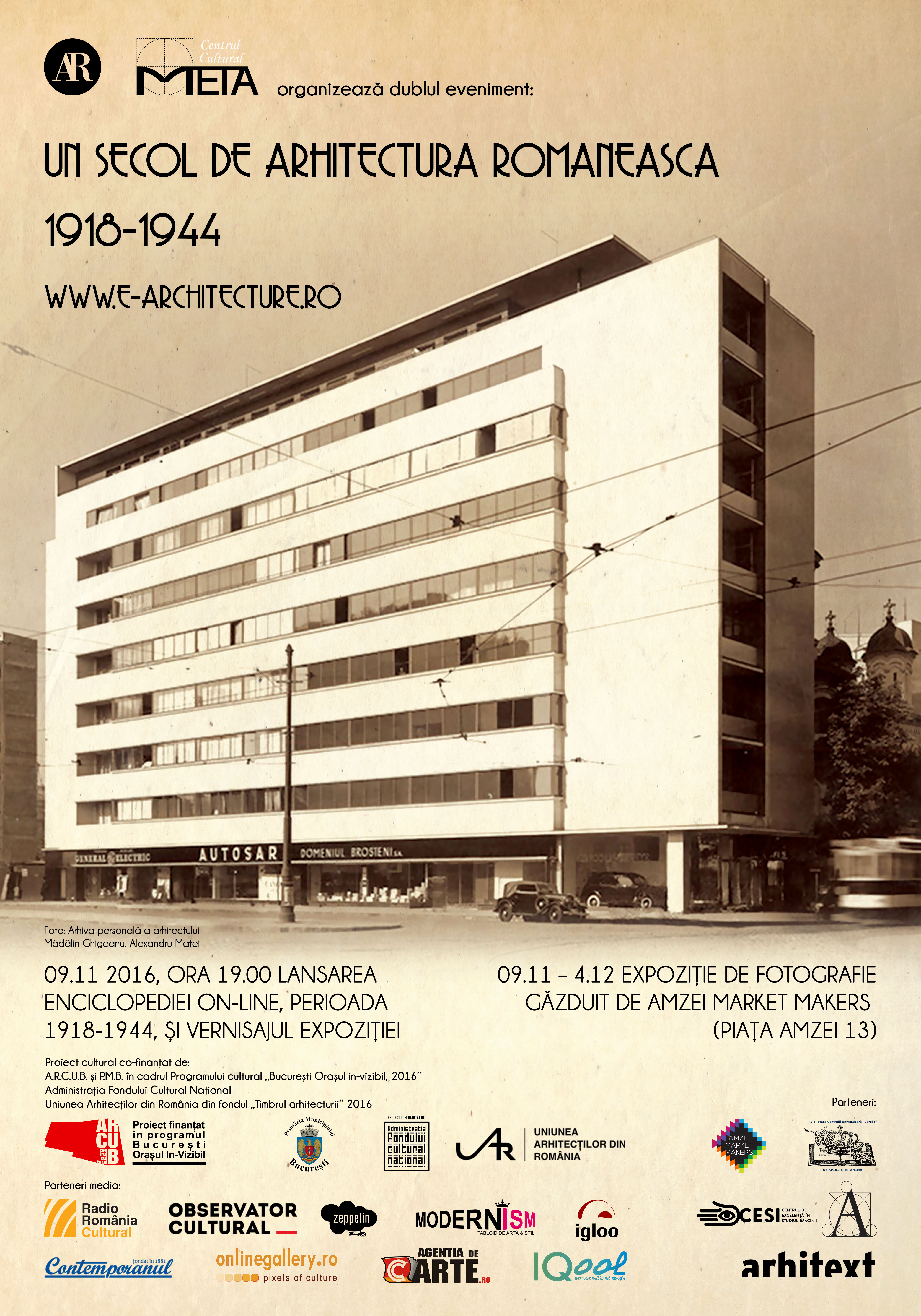 Fundația Culturală META vernisează expoziția de fotografie și lansează enciclopedia online "Un secol de arhitectură românească" (perioada 1918-1944), miercuri, 9 noiembrie, de la ora 18:30, în Piața Amzei.