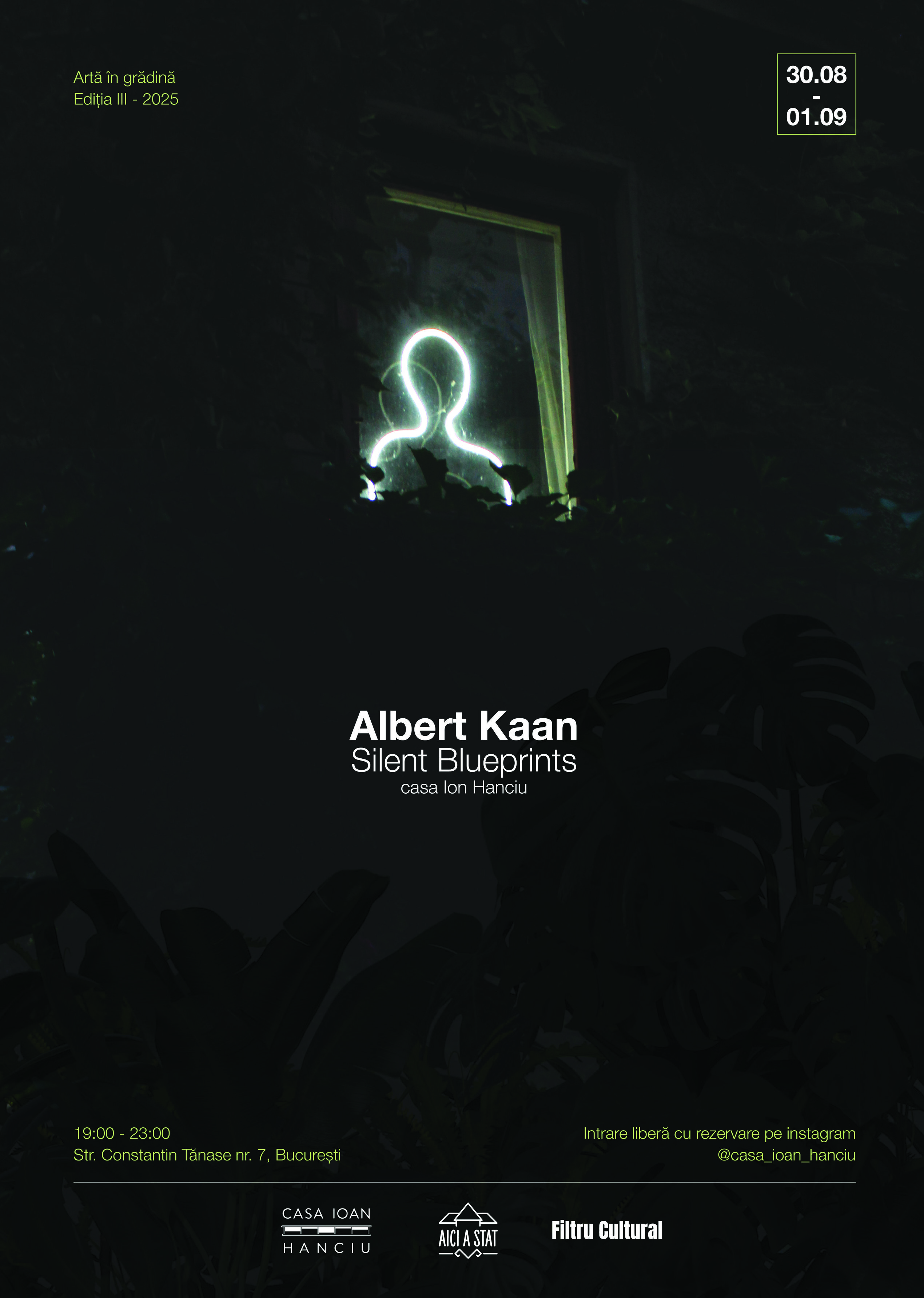 Deschis între orele 19:00 și 22:00, în perioada 30 august - 1 septembrie. Intrarea este gratuită, cu rezervare prin linkul din bio Instagram.