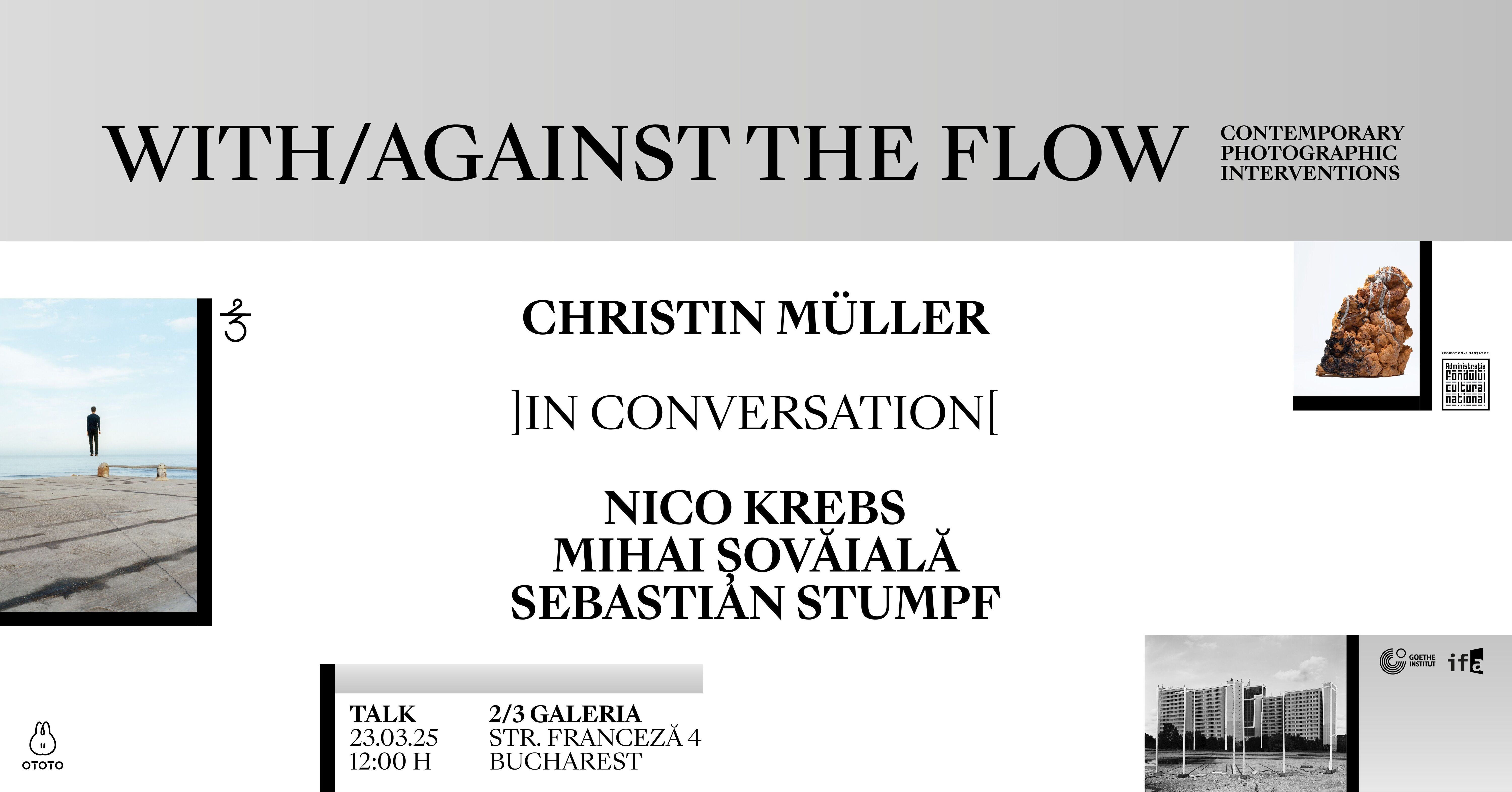 „Viața noastră contemporană este în mod substanțial modelată de o cultură a imaginii care evoluează tot mai mult în spațiile digitale. În același timp, globalizarea în avans, schimbările socio-politice și tehnologice caracterizează spațiile urbane. Discuția se va concentra asupra modului în care artiștii înregistrează și comentează aceste schimbări masive prin fotografie. Vom discuta despre cum o înțelegere extinsă a acestui mediu, care include intervenții artistice, pune în evidență structuri urbane sau goluri adesea neobservate și despre cum efectele de suspans și surpriză oferă o viziune alternativă asupra mediului nostru cotidian.Dialogul cu artiștii are loc în contextul expoziției „With/Against the flow. intervenții fotografice contemporane”, de la 2/3 Galeria și Goethe-Institut București.” Christin Müller