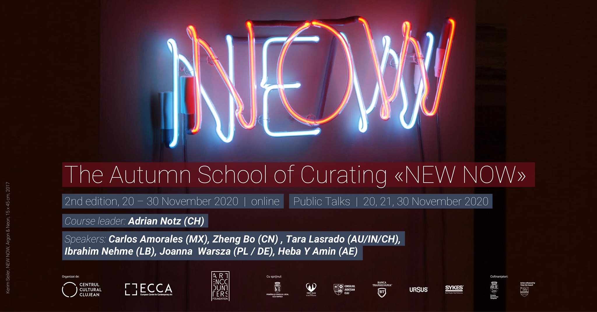În perioada 20 – 30 noiembrie va avea loc Școala Curatorială de Toamnă <NEW NOW>, un program internațional, organizat de Fundația Art Encounters în colaborare cu Centrul Cultural Clujean, prin proiectul ECCA (The European Center for Contemporary Art), cu scopul de a crea o platformă de dialog, schimb de cunoaștere și învățare pentru tineri curatori. Programul se află anul acesta la cea de-a doua ediție, prima ediție având loc în 2019, la Cluj și Timișoara, în timpul Bienalei Art Encounters. Spre deosebire de prima ediție, Școala curatorială de toamnă <NEW NOW> se va desfășura exclusiv online, avându-l ca lider de curs pe curatorul Adrian Notz.
