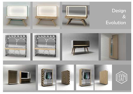 Înăuntru găsim o diversitate subtilă de pattern-uri, pereți de culori, stiluri, texturi și materiale diferite, cele de genul care îți lasă privirea să respire. În perimetrul lor, esteticul și funcționalitatea se intersectează, iar obiectele de design vin perfect în completarea aparatelor și sistemelor tehnice (mobilier și accesorii pe roți, proiector, echipament foto, inclusiv un depozit de materiale). Tot cei de la 13x14 au venit cu ideea unei cabine de probă mobile, proiectată special pentru studioul foto. Sprijinul logistic și de producție a fost acordat de Kaustik, iar o altă contribuție îi aparține constructorului Adrian Hilohi.