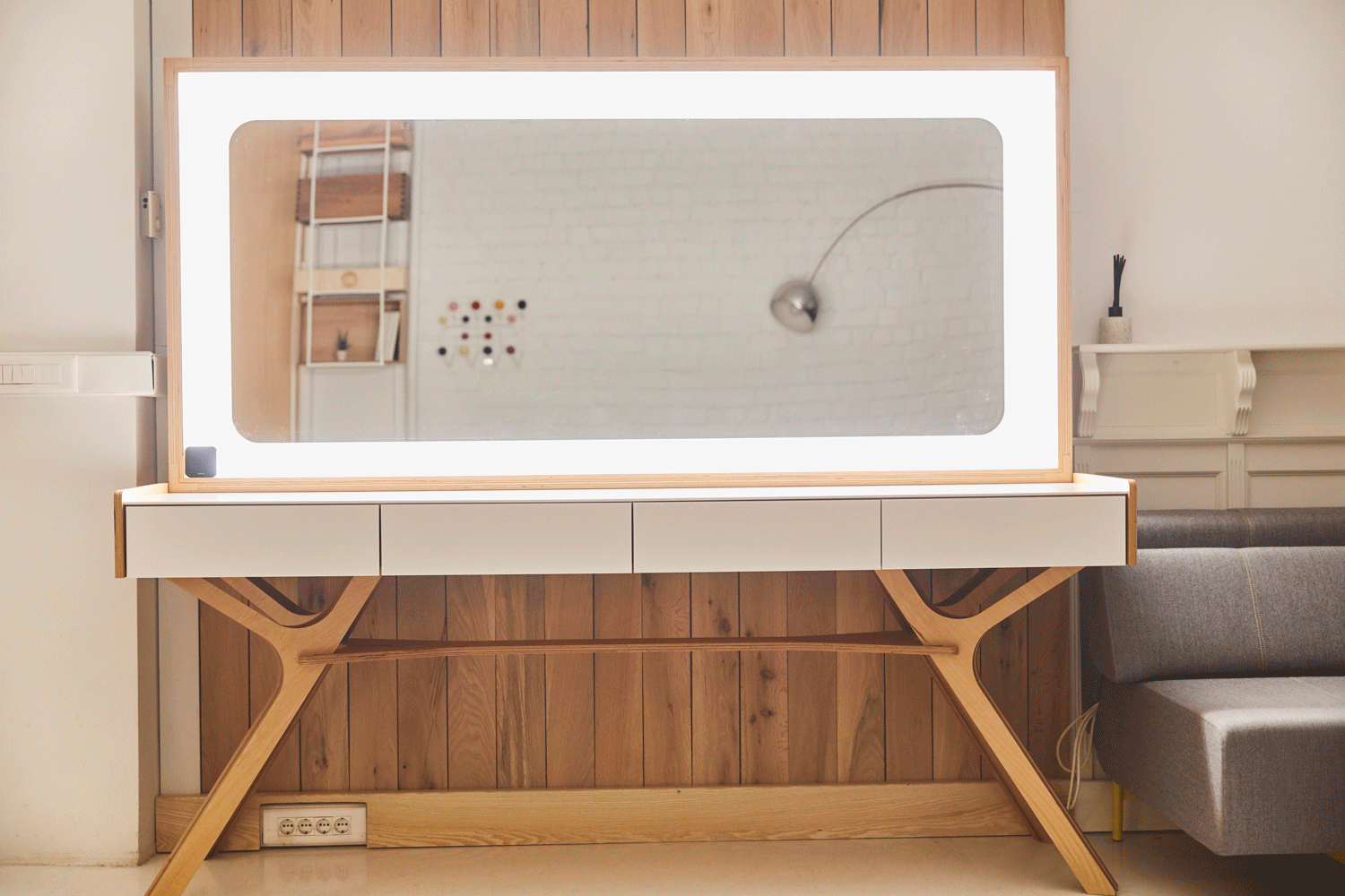 “Am ținut neapărat să apelăm și la designul românesc. La Romanian Design Week am descoperit grupul 13x14 (Andrei Fenio și Florina Anghelescu) care a definit o mare parte din estetica spațiului. Ei sunt responsabili pentru mesele de machiaj special create pentru 82, dotate cu lumini Philips Hay, prin care se pot regla temperatura și intensitatea luminii, dar și jocurile de culori.”