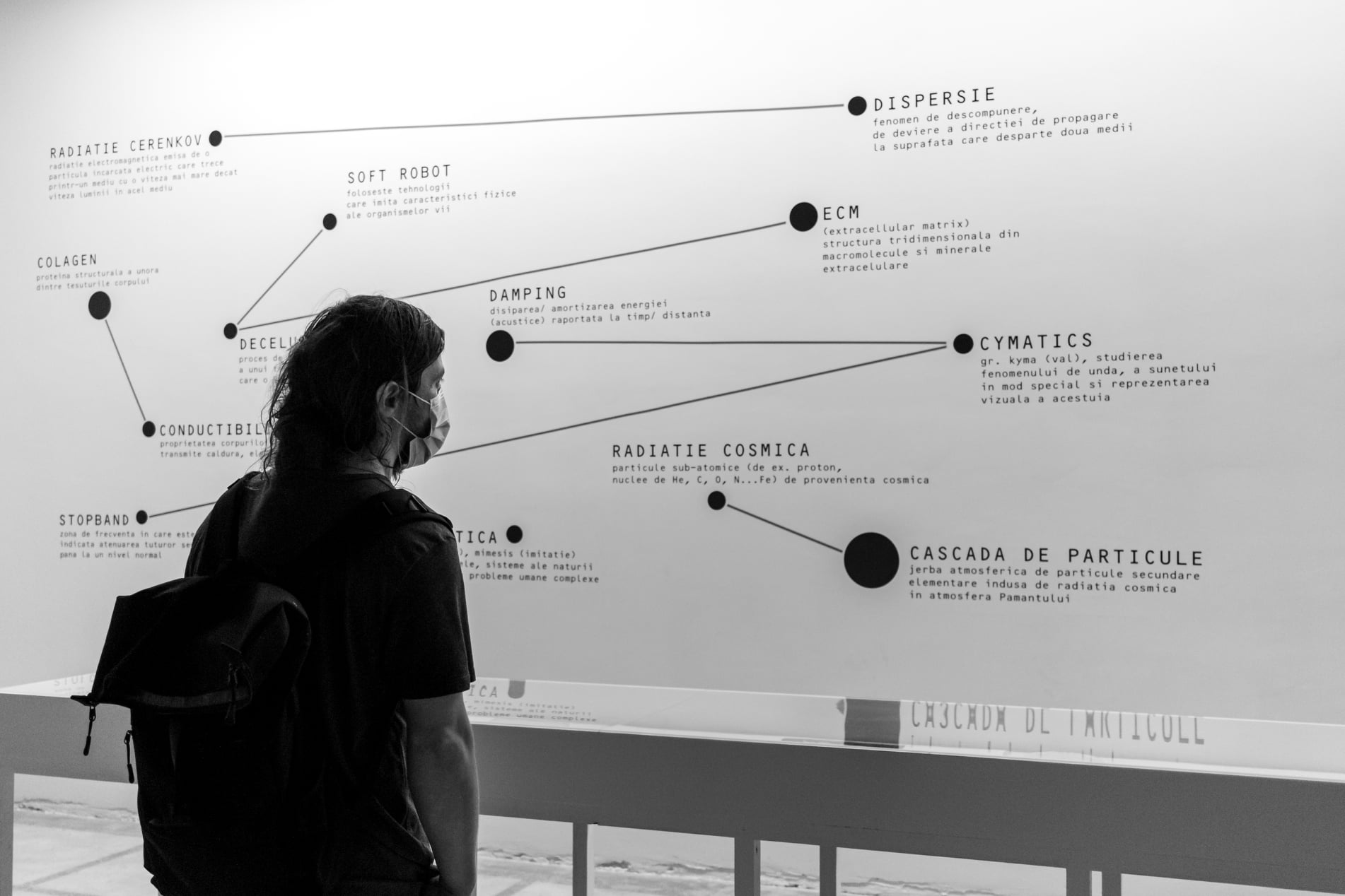 / Lucrarea din cadrul expoziției – Arheologia invizibilului – ecouri din Universul îndepărtat: instalație multimedia care vorbește în cheie poetică despre modalități posibile de reprezentare a interacțiunii particulelor de energie înaltă cu atmosfera terestră