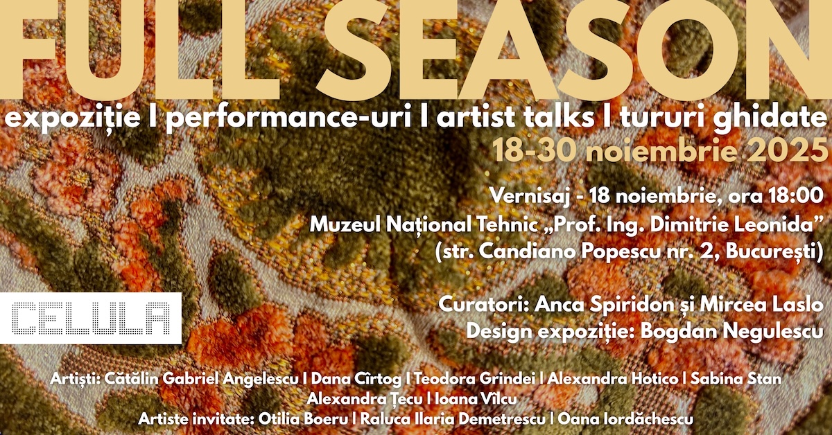 Celula de Artă prezintă „Full Season” – o expoziție ce încheie sezonul din 2025 al Galeriei Verticale, spațiul Celulei de Artă aflat în incinta Random Space, care va avea vernisajul pe 18 noiembrie, de la ora 18:00, la Muzeul Naţional Tehnic “prof. ing. Dimitrie Leonida”(Str. Candiano Popescu nr. 2, în Parcul Carol I, București). Expoziția reunește lucrări semnate de artiștii care au expus în Galeria Verticală: Alexandra Hotico, Alexandra Țecu, Cătălin Gabriel Angelescu, Dana Cîrtog, Ioana Vîlcu, Sabina Stan și Teodora Grindei, cărora li se alătură artistele invitate Oana Iordăchescu, Otilia Boeru și Raluca Ilaria Demetrescu. Expoziția este curatoriată de Anca Spiridon și Mircea Laslo, iar designul de expoziție este realizat de Bogdan Negulescu. Publicul va putea vizita lucrările și instalațiile artistice până pe 30 noiembrie, de miercuri până duminică, între orele 9:30 – 17:00.