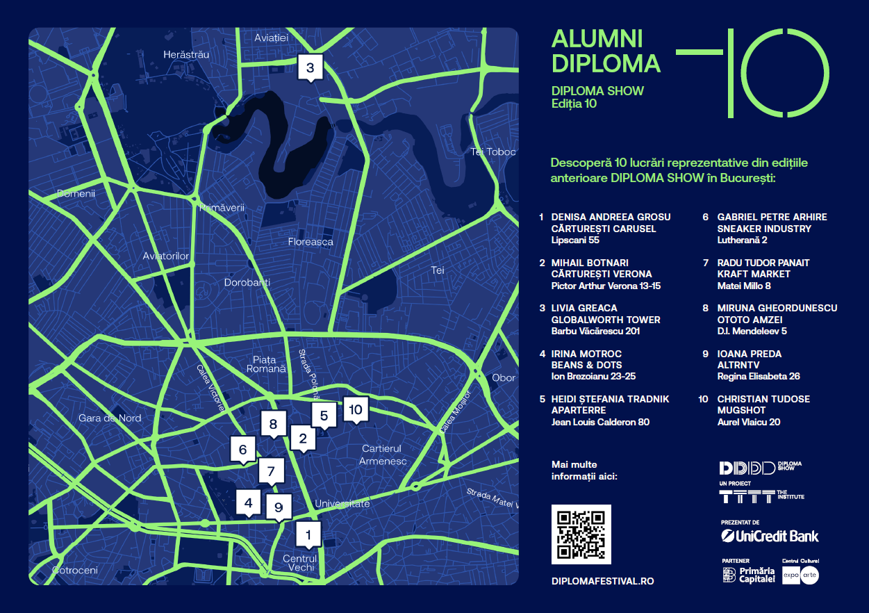 DIPLOMA Show, festivalul noii generații de artiști, arhitecți și designeri români, organizat de The Institute și prezentat de UniCredit Bank la Combinatul Fondului Plastic între 7 și 15 octombrie, reunește anul acesta 130 de lucrări din 16 domenii creative, alese dintr-un număr record de înscrieri. DIPLOMA Show marchează a X-a ediție a festivalului cu o serie de noutăți și evenimente, printre care și o campanie aniversară ce aduce în fața publicului larg 10 alumni DIPLOMA Show în 10 locuri din Capitală, într-o expunere inedită.