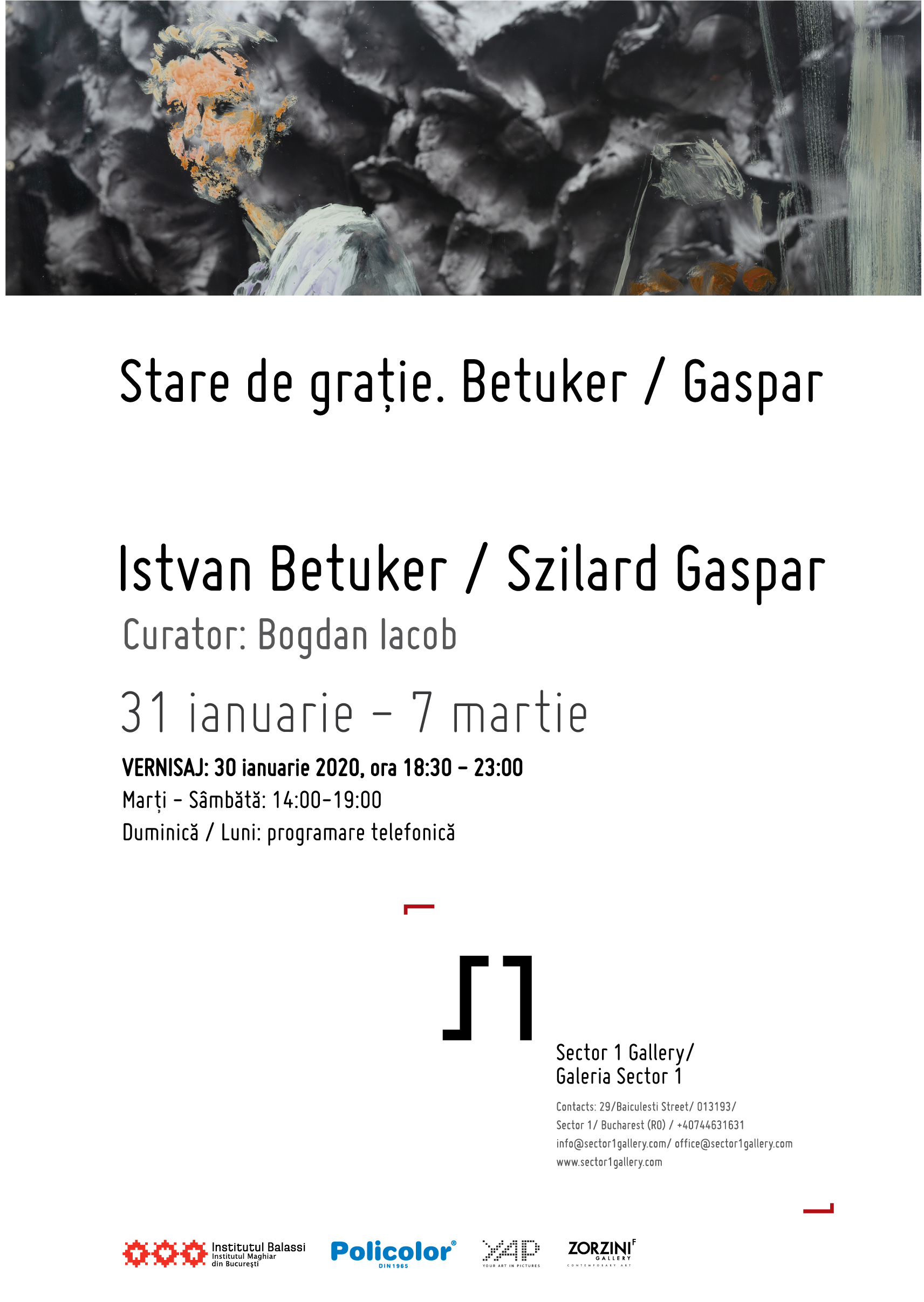 Galeria Sector 1 deschide programul curatorial al anului 2020 cu duo show-ul Stare de grație. Betuker / Gaspar al artiștilor Istvan Betuker, pictor, și Szilard Gaspar, sculptor, performance artist și boxer profesionist. Concepută ca o conversație între medii, expoziția își propune să dezvăluie ceva din intimitatea creativă a celor doi artiști aflați pentru prima dată într-un dialog exclusiv.