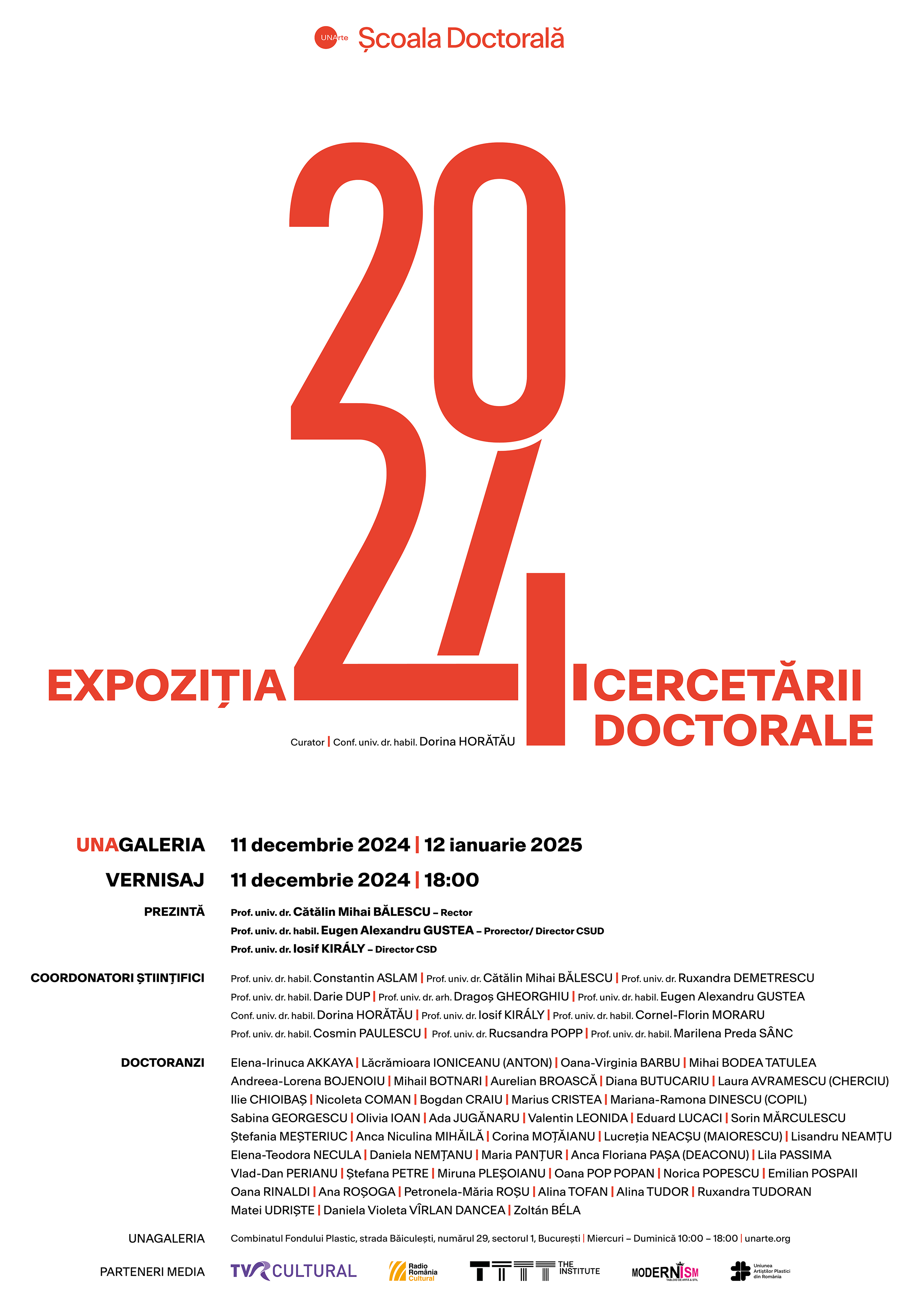 Școala Doctorală a Universității Naționale de Arte București organizează la UNAgaleria a treia ediție a expoziției cu lucrările asociate activității de cercetare a doctoranzilor.Vernisajul expoziției, curatoriată de conf. univ. dr. habil. Dorina HORĂTĂU, are loc miercuri, 11 decembrie 2024, ora 18: 00, în prezența prof. univ. dr. Cătălin BĂLESCU – rector, prof. univ. dr. Eugen Alexandru GUSTEA – prorector și director CSUD și prof. univ. dr. Iosif KIRÁLY – director CSD.