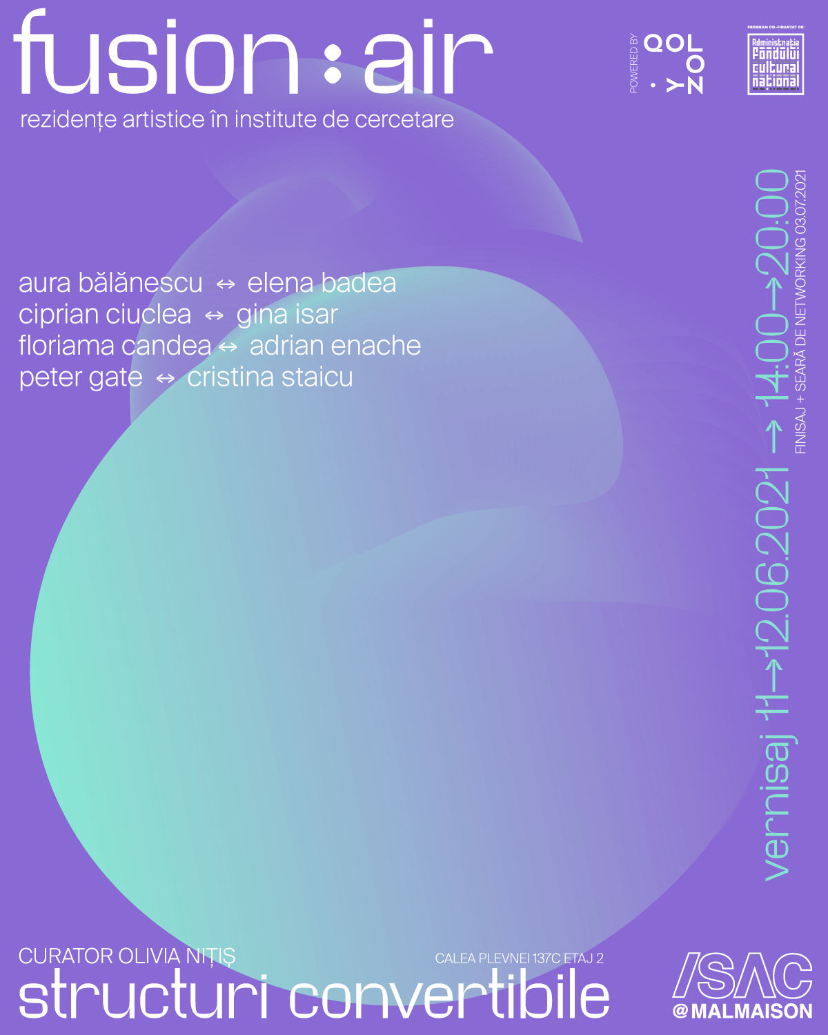 Fusion AIR, unicul proiect românesc de rezidențe artistice în institutele de cercetare, inițiat și organizat de Asociația Qolony (Colonia pentru Artă și Știință), se apropie de final, iar la sfârșitul săptămânii viitoare va avea loc deschiderea expoziției ce reunește lucrările celor patru artiști. Evenimentul va avea loc pe datele de vineri, 11 iunie, și sâmbătă, 12 iunie, cu începere de la ora 14.30, în cel mai nou spațiul expozițional din capitală, /SAC @ MALMAISON situat în strada Plevnei nr. 137C, et. 2. Expoziția va fi deschisă cu acces liber, timp de trei săptămâni, până pe data de 3 iulie, inclusiv; program de vizitare: miercuri - vineri, orele 15:00 - 19:00.