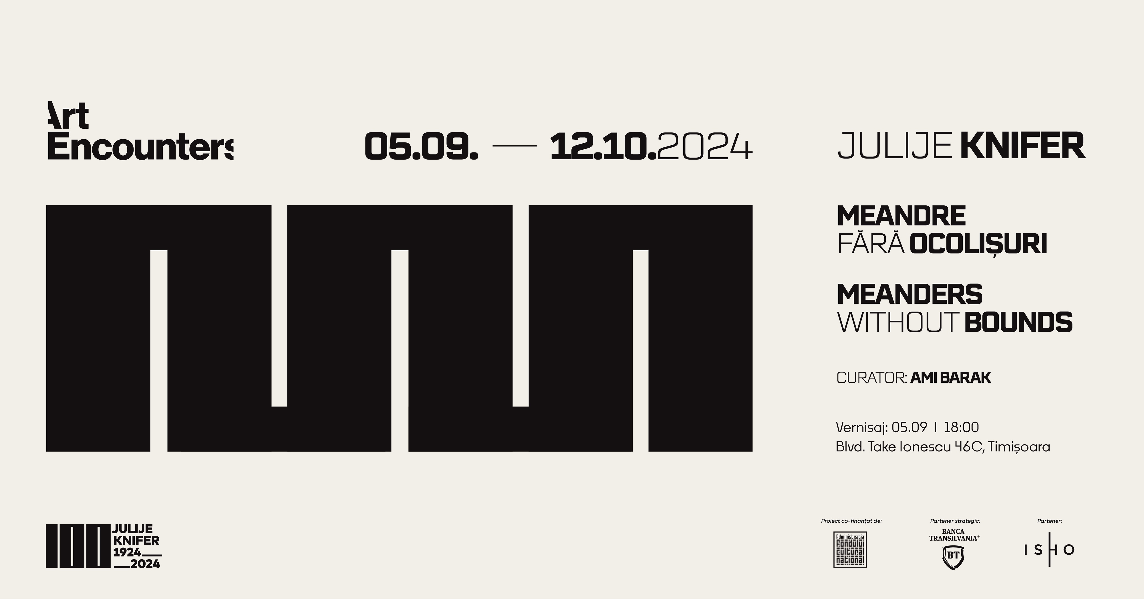 Expoziția Julije Knifer- Meandre fără ocolișuri este organizată de către Fundația Art Encounters și cofinanțată de AFCN. Un eveniment posibil datorită parteneriatului strategic cu Banca Transilvania, a partenerilor ISHO, Cramele Recaș, Volvo Autocardo și a partenerilor media, Empower Artists, Radio Romania Cultural, RFI România, The Institute, Zeppelin, Revista Arta.