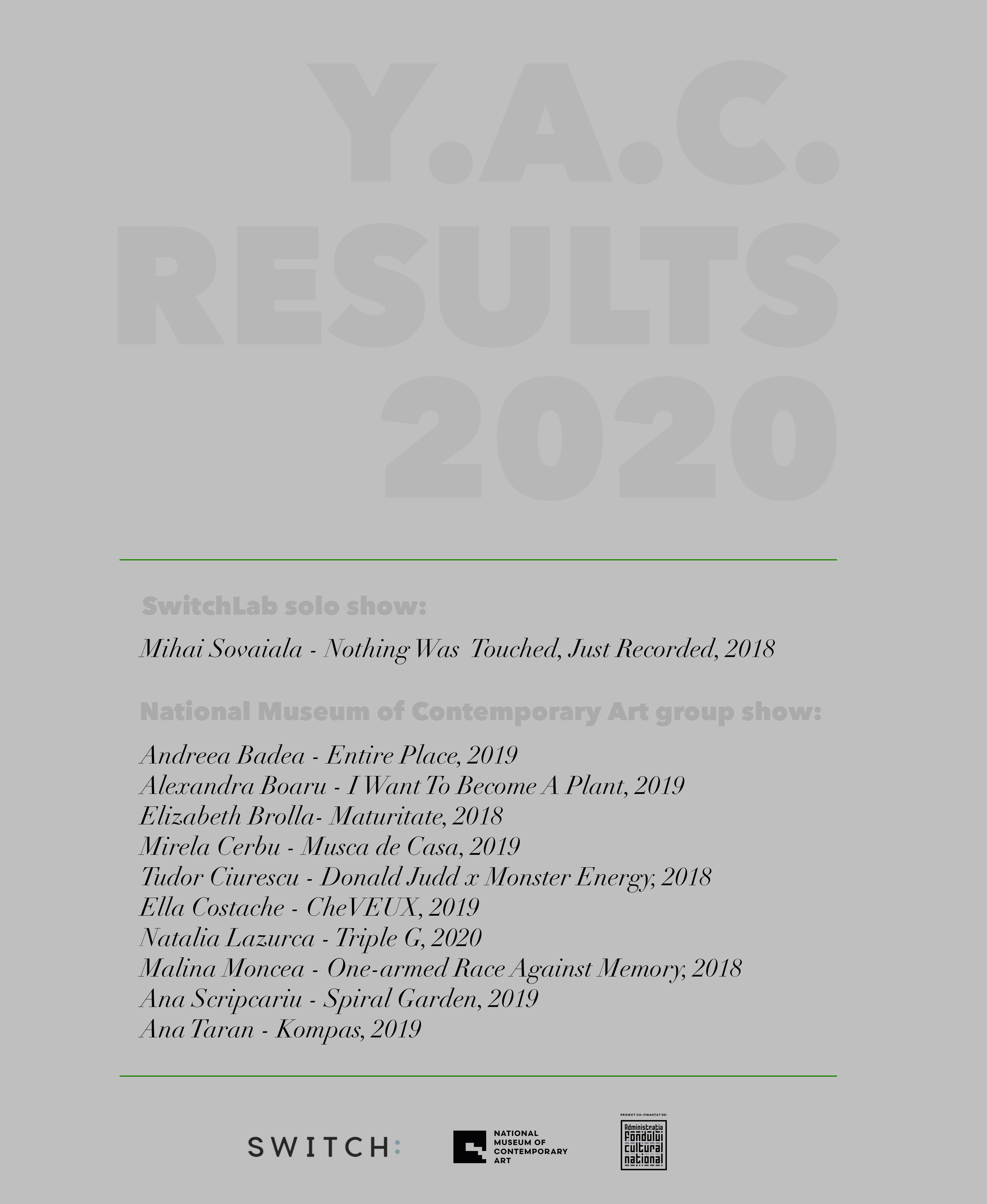 În iulie 2020 Switch Lab a lansat un call pentru tineri artiști din domeniul artelor vizuale. Au aplicat peste 200 de tineri din România și străinătate, din care au fost selectați 10 artiști care vor expune într-o expoziție de grup la Muzeul Național de Artă Contemporană (2 octombrie - 1 noiembrie) și un artist care va avea un solo show la galeria Switch Lab (9-16 octombrie).