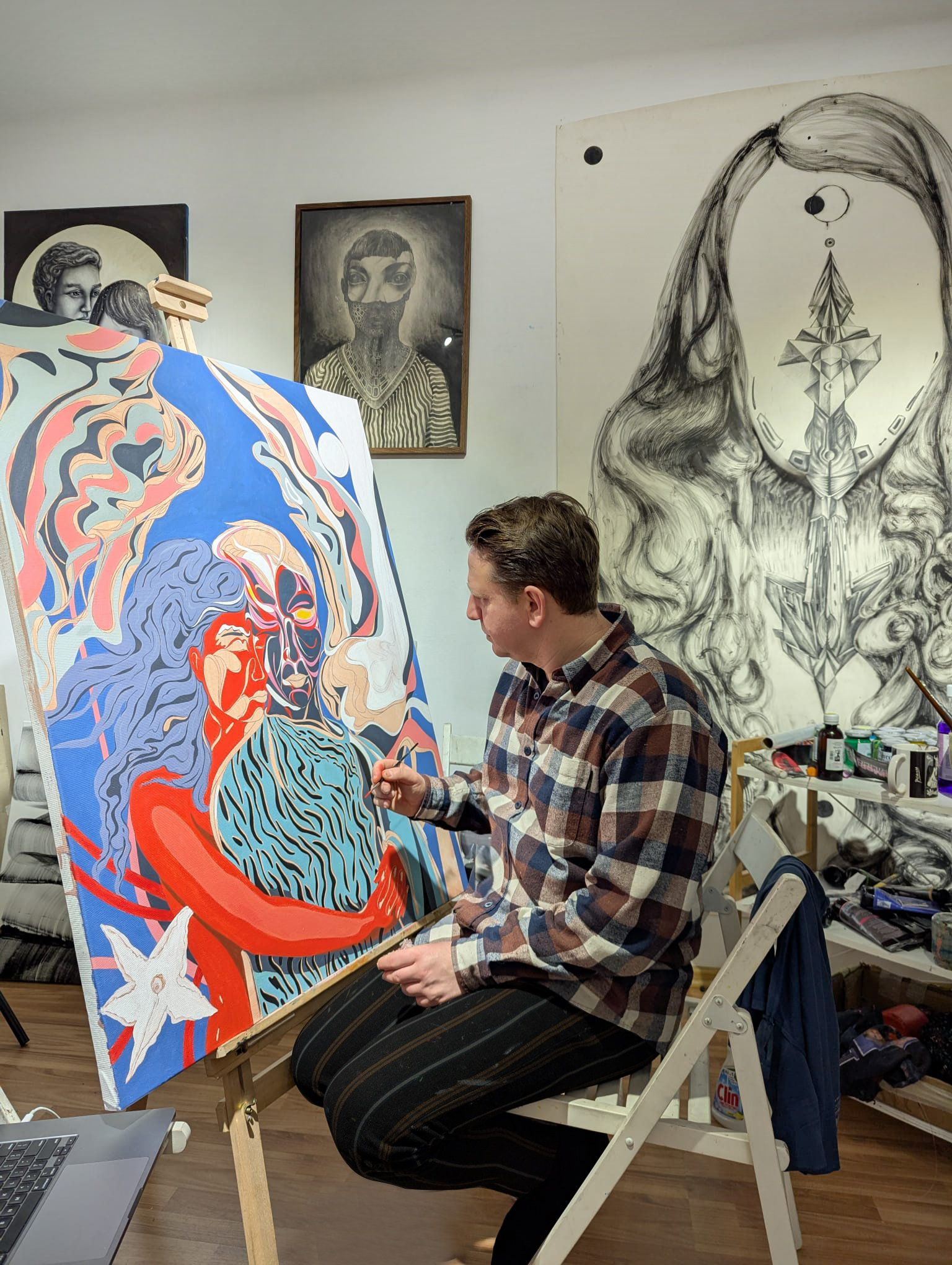Expoziția reunește lucrări reprezentative din parcursul artistic al lui Flaviu Moldovan, incluzând piese precum „Guernica 2016”, o reinterpretare a capodoperei lui Picasso ca răspuns la un război invizibil, „Actress, the 1st”, un portret al unui DJ văzut ca o entitate mistică a erei clubbing, și „Drumul spre centru”, un autoportret simbolic despre filtrarea și interpretarea informațiilor.