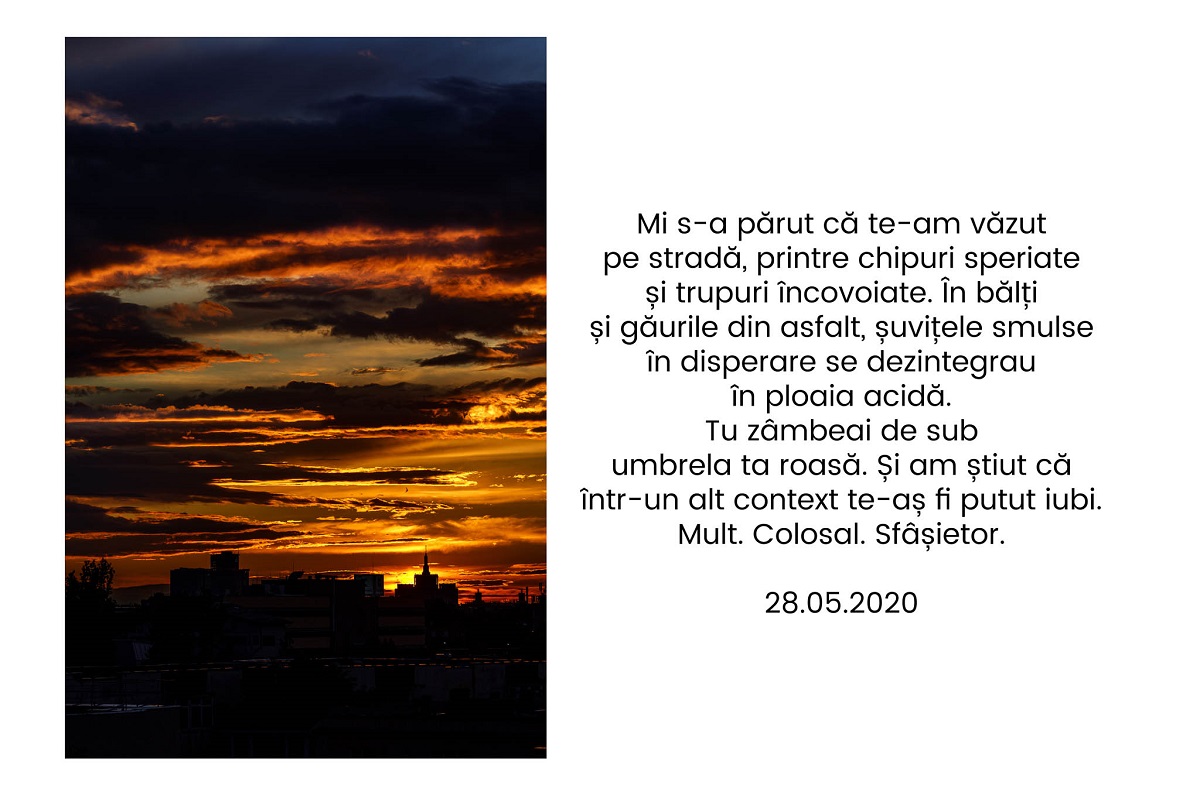 În 11 martie 2020 am intrat în autoizolare. Nu am știut ce va urma, îmi era teamă. Mi-am dat seama că va fi un an pierdut, asta dacă voi supraviețui virusului. Știam că va fi o perioadă grea și nelimitată în care mă voi redescoperi sau mă voi sui pe pereți. În tot acest timp, însă, m-am îndrăgostit, și ce urma să contureze o serie de momente grele, a creionat cea mai faină perioadă din viața mea, am redescoperit atașamanetul și faptul că încă mai simt, si vai cum am simțit.
