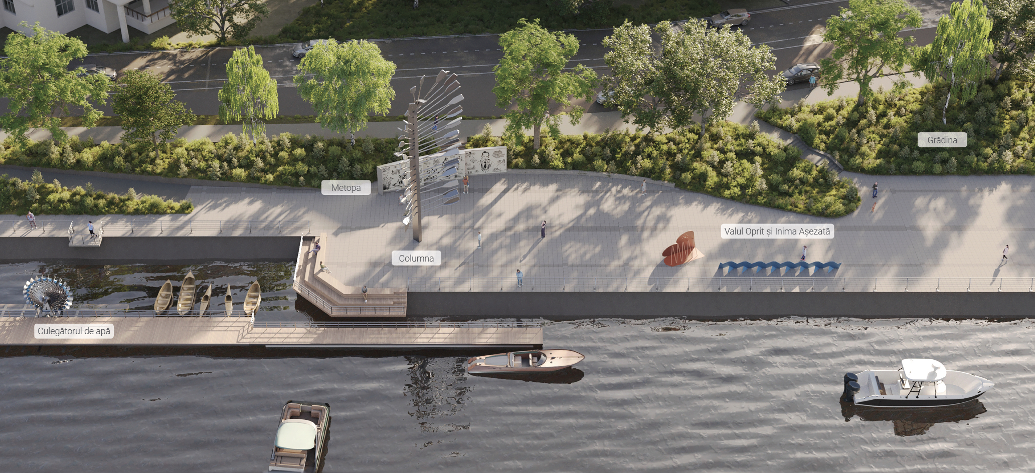 Inaugurarea Memorialului va avea loc vineri seara și va fi însoțită de un concert pe apă, de o defilare de ambarcațiuni pe Dunăre și de un spectacol de video-mapping pe clădirile Căpităniei, a Muzeului de Artă și a Centrului de proiectări. Sâmbătă, 9 septembrie, artiștii și curatorul vor fi prezenți lângă opere, pentru a le prezenta publicului (între orele 10:00 – 11:00 și, apoi, între 17:30 – 18:30).