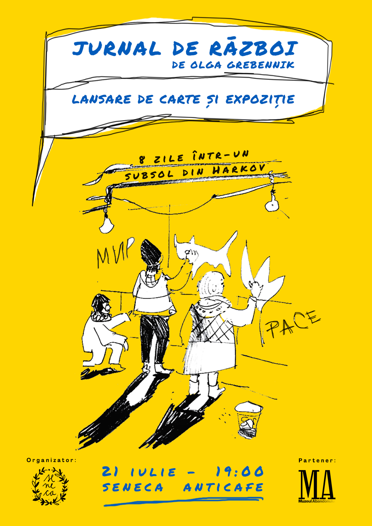 Joi, 21 iulie, ora 19.00, la Seneca Anticafe (Arhitect Ion Mincu nr. 1) a avut loc dialogul cu scriitoarea Olga Grebennik pentru lansarea cărții Jurnal de Război și vernisajul cu vânzare al lucrărilor artistei.