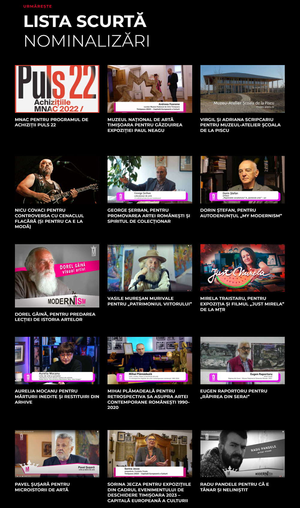 Cu ocazia împlinirii a 15 ani de activitate în promovarea artei contemporane și a peste 500 de materiale video originale (interviuri, documentare, no comment, expoziții) pe canalul YouTube, se lansează premiul Modernism.ro Award 2023, un trofeu de colecție, unicat, acordat în funcție de preferințele și vizualizările publicului. Platforma Modernism.ro se situează printre cele mai cunoscute și vizitate produse online de profil, cu un număr de peste 623.200 impressions pe YouTube și peste 24.000 de ore de vizionare a materialelor video produse original.Trofeul din acest an este un obiect de colecție și fost realizat handmade de Cristi Farcaș, edițiile viitoare urmând a fi realizate / personalizate de către câștigătorul din anul precedent.