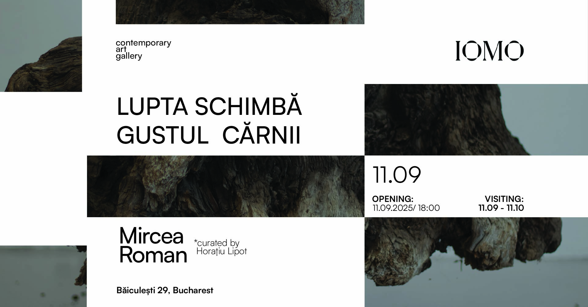 IOMO Gallery anunță, pentru 11 septembrie ora 18:00, deschiderea expoziției personale a artistului Mircea Roman. Curatoriată de Horațiu Lipot, aceasta este intitulată “Lupta schimbă gustul cărnii” și poate fi vizitată până la data de 11 octombrie 2025.