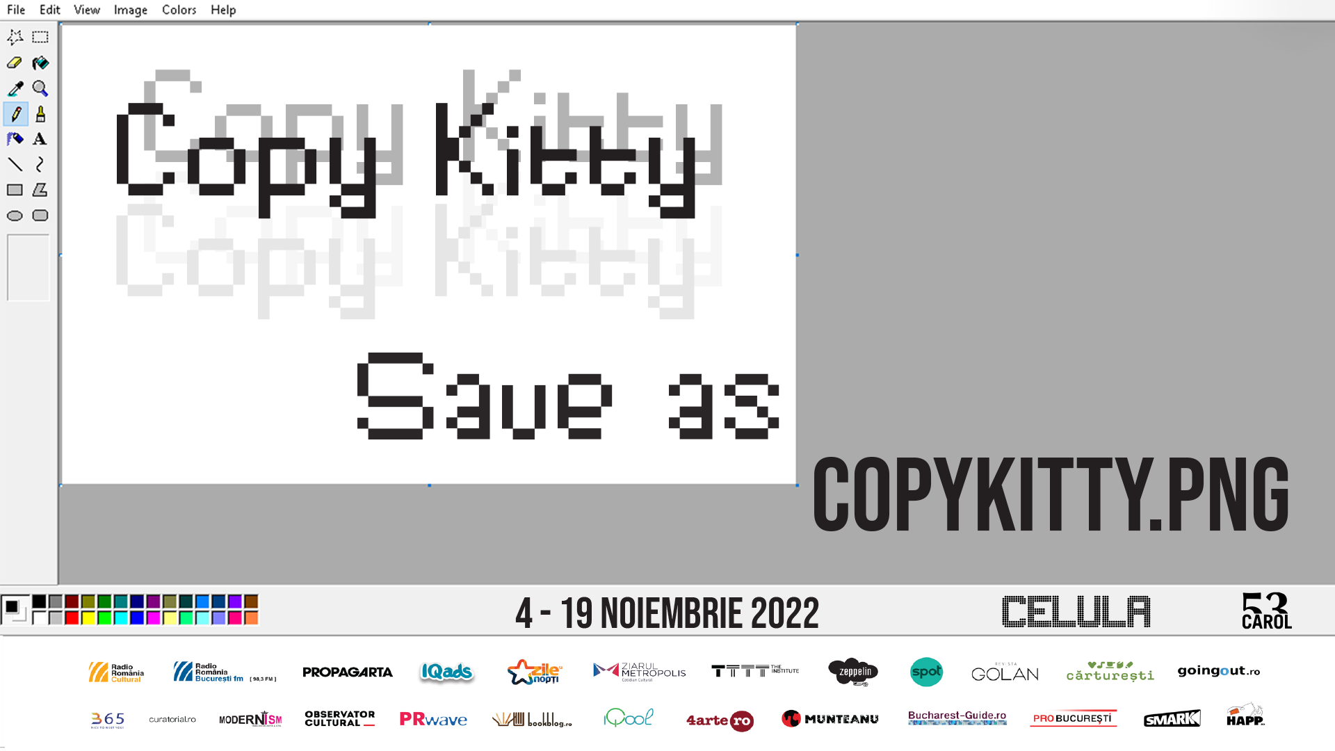 Începutul lunii noiembrie aduce o nouă expoziție în galeria neconvențională Celula de Artă din B-dul Carol nr. 53, Save as Copykitty.png, ce propune o serie de lucrări de artă celebre reinterpretate într-un mod jucăuș și accesibil de către artista Copy Kitty. Vernisajul va avea loc pe 4 noiembrie, începând cu ora 19:00, iar expoziția va putea fi vizitată până pe 19 noiembrie.