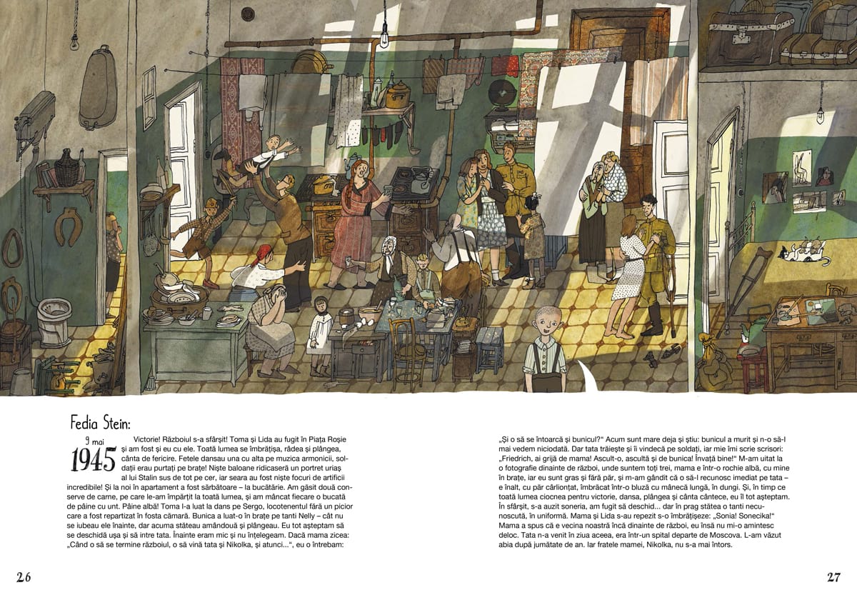 Cartea alternează intrările de tip jurnal, în care un membru al familiei povestește întâmplări personale pe fondul unor evenimente politice, și planșele de tip colaj, în care găsim relatări obiective ale istoriei. Este o incursiune fascinantă și în istoria obiectelor vremii: jucării, piese de mobilier, obiecte casnice, fragmente de ziare, fotografii și poezii, toate ordonate în planșe de tip colaj, minuțios ilustrate. Unele obiecte dispar, înghițite de iureșul istoriei, altele sunt păstrate de la o generație la alta.