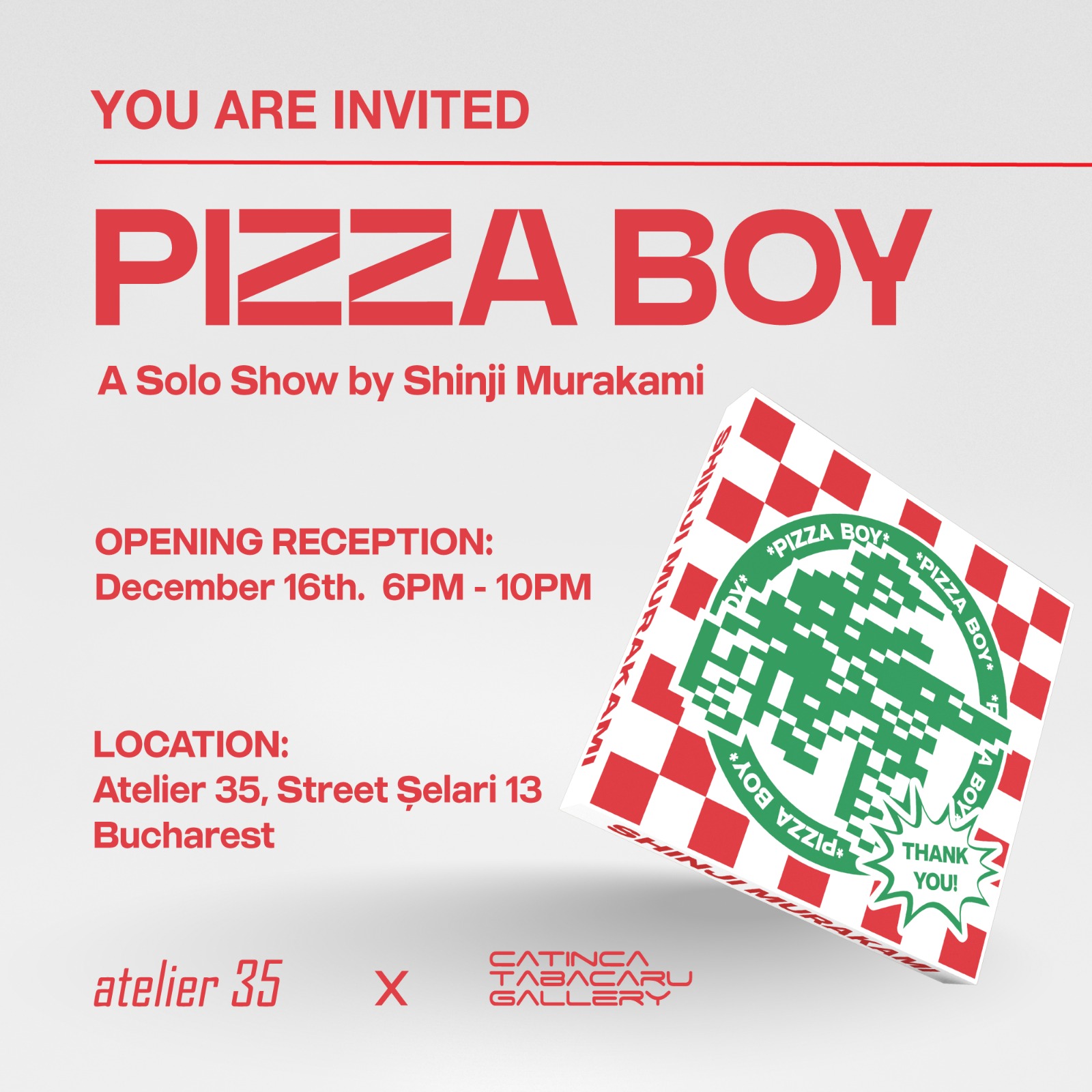 Atelier 35 în colaborare cu Catinca Tabacaru este încântat să prezinte Pizza Boy, prima expoziție personală a artistului japonez Shinji Murakami la București, al cărei vernisaj va avea loc la Atelier 35, pe 16 decembrie, între orele 18:00-22:00.