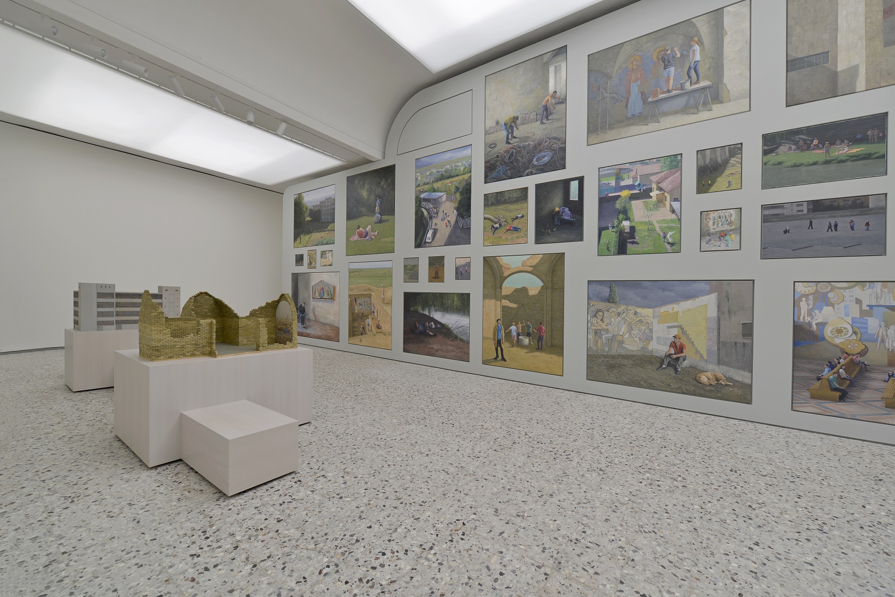 În Pavilionul României, vizitatorii sunt întâmpinați de un poliptic amplu, cuprinzând 45 de picturi – o privire condensată asupra practicii lui Savu din ultimii cincisprezece ani. Protagoniștii dezorientați și figuranții stângaci din imagini par angrenați în ritualuri care seamănă în egală măsură cu munca și cu recreerea. Pe banca din fața polipticului oamenii se pot așeza pentru a admira și interacționa cu opera lui Șerban Savu. Mergând de la blocul în care Savu a crescut până la o biserică în ruină și un sit arheologic, machetele, din aceea zonă sunt decorate cu mozaicuri care se îndepărtează de temele uzual ilustrate în contexte religioase sau în cosmogoniile muncii din arta socialistă. În loc să înfățișeze mari realizări industriale sau apoteoze mistice, mozaicurile vorbesc despre eșec, ambiguitate și perplexitate. Picturile și mozaicurile compun un spațiu în care vizitatorii sunt confruntați cu o chestionare a muncii prin intermediul definițiilor sale negative: ce nu este munca, ce nu arată a muncă și ce nu înseamnă munca.