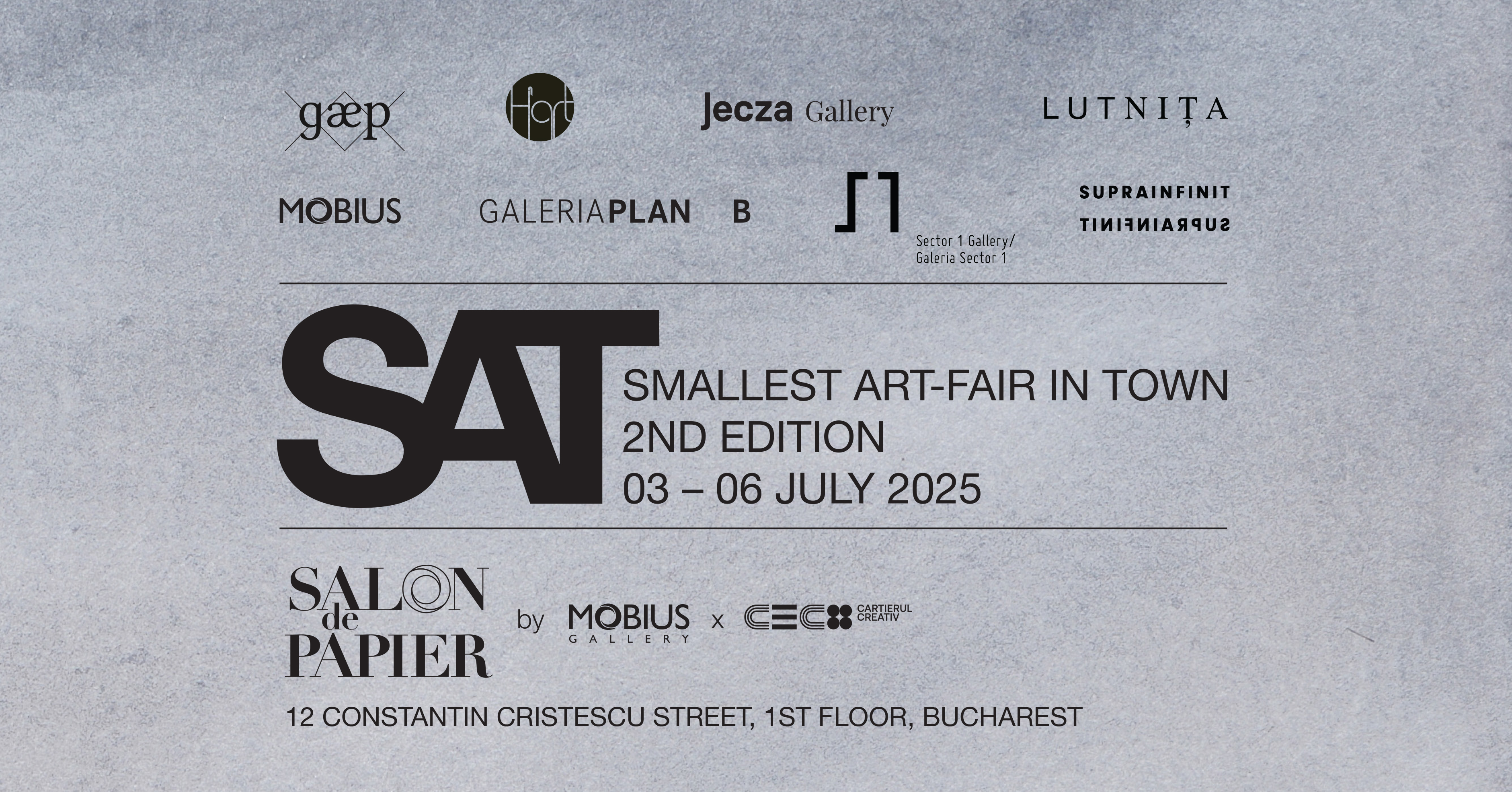Între 3 și 6 iulie 2025 are loc a doua ediție a SAT – THE SMALLEST ART FAIR IN TOWN, singurul târg din România dedicat exclusiv lucrărilor pe hârtie. Păstrând spiritul primei ediții, SAT respinge formatul clasic cu standuri și oferă un spațiu comun de expunere, sub tema curatorială „REALITĂȚI ÎNTRERUPTE”. Evenimentul se adresează publicului larg, colecționarilor aflați la început de drum și celor consacrați, oferind acces gratuit și un cadru deschis pentru explorarea artei contemporane. SAT este astfel o platformă de dialog despre viitorul pieței locale de artă, ghidată de incluziune și cooperare.