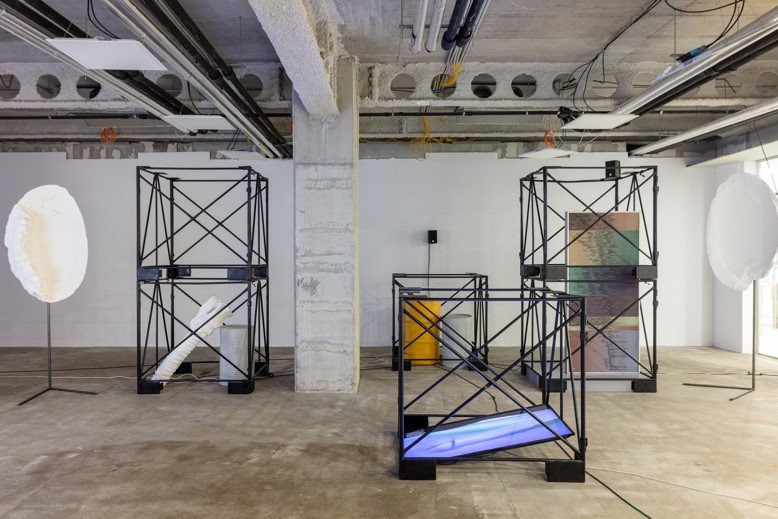 Laure Prouvost (plan îndepărtat): Sunați, cântați, beți pentru fărădelegi / Ring, Sing and Drink for Trespassing, 2018. Instalație /Installation