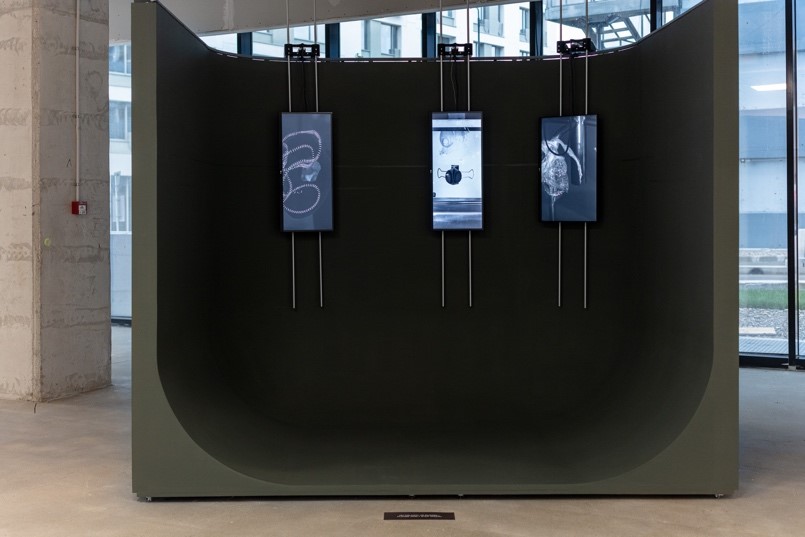instalație video pe trei canale, cicloramă, lemn, oțel, aluminiu, fotografii 3D, motoare, scenariu / three-channel video installation, cyc wall, steel, aluminium, 3D prints, motors, script