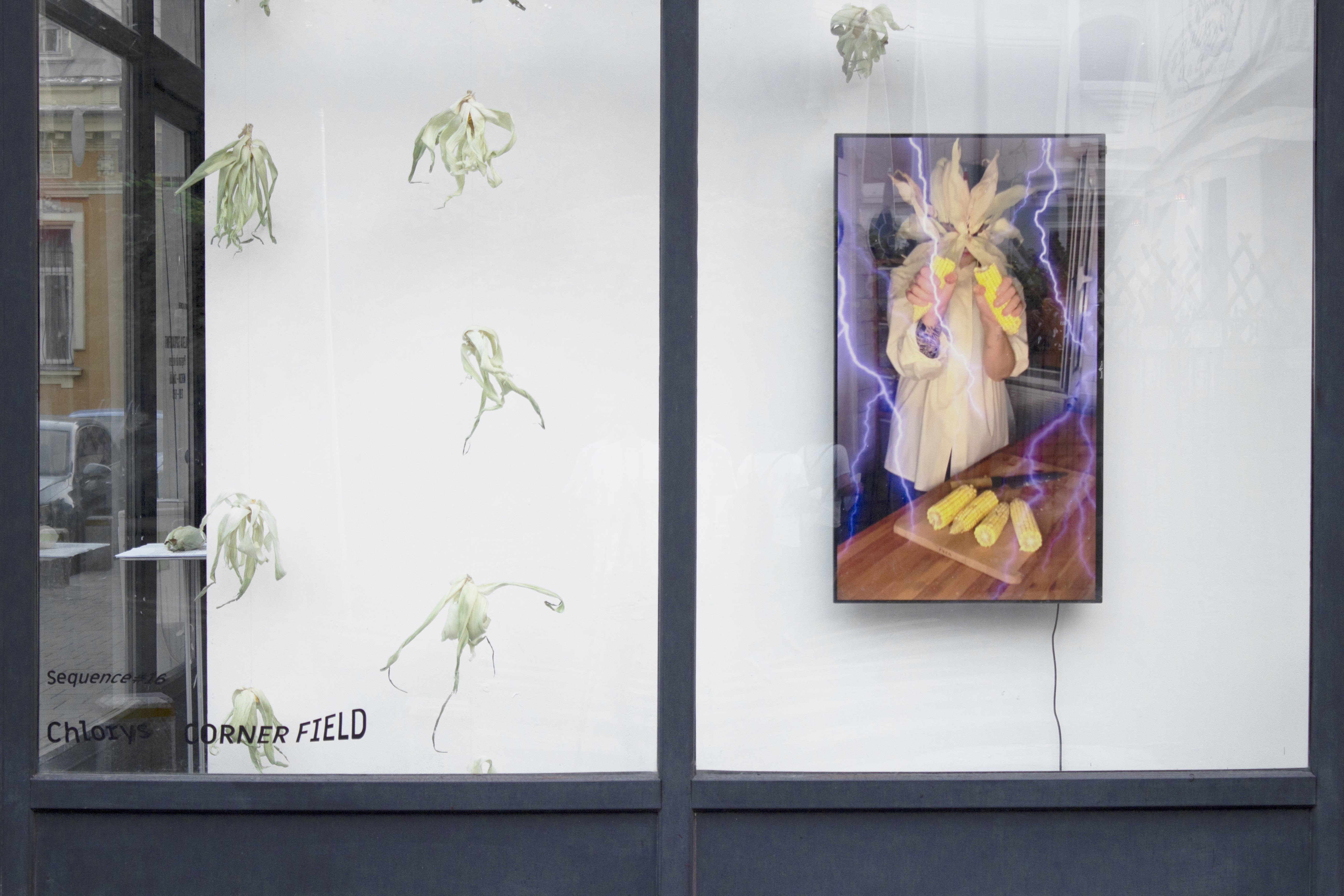 CORNER FIELD este un joc de cuvinte care se referă la acel ,,loc chiar după colț unde se servește porumb’’, cu accent pe proximitatea care face fiecare magazin din colț convenabil și accesibil pentru comunitate și persoanele din zonă. Instalația regândește logica vitrinei în mediul urban, acele spații în care neoanele și reclamele anunță promisiunile consumerismului, adresând o nouă urgență a prezentului, aceea de fi angajat în momente prelungite de observație și repaus. Porumbul fiert generează o experiență colectivă familiară, în timp ce învelișul porumbului, aranjat în structuri plutitoare și fibroase, comunică modul în care Chlorys alege să se raporteze la risipă în peisajul contemporan industrializat.