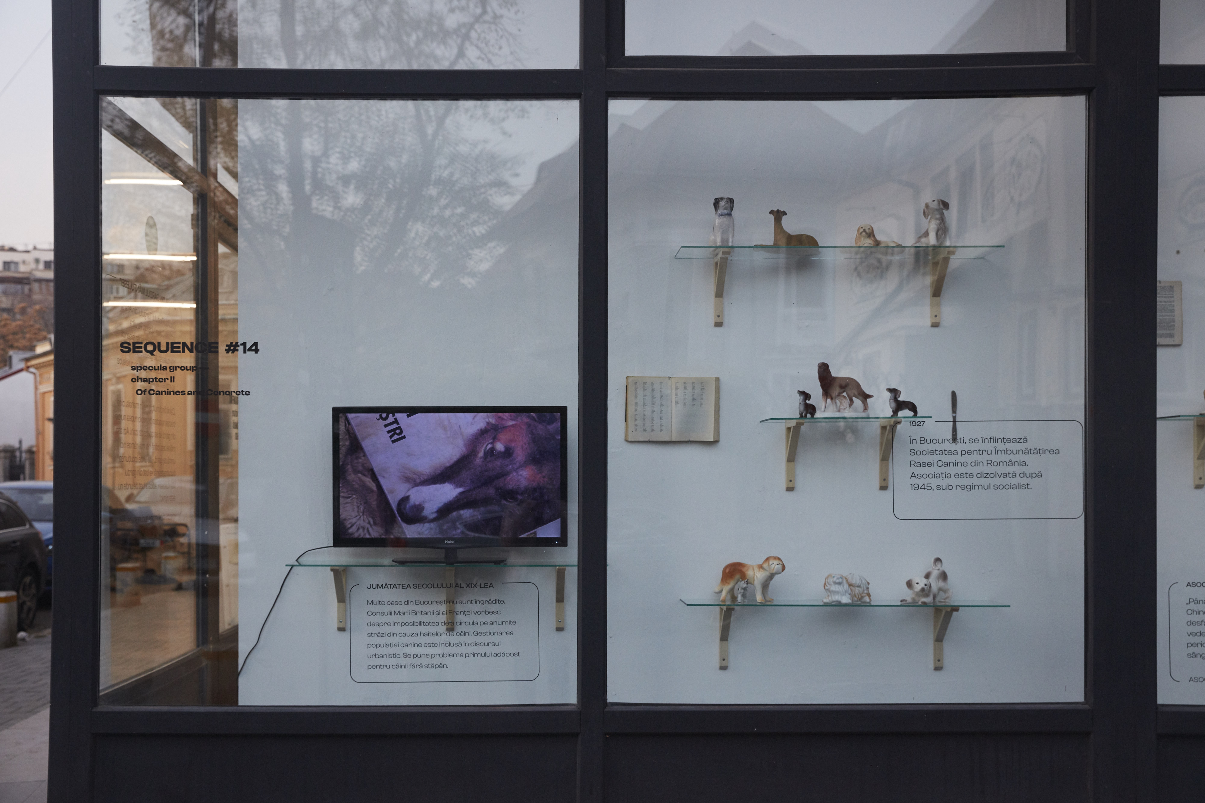 Istoria Bucureștiului nu este o istorie exclusiv umană. Cea de-a doua intervenție a specula group din vitrina galeriei, Of Canines and Concrete, cercetează printr-o instalație multimedia relațiile interspecice dintre câini și oameni în contextul bucureștean, plecând de la una dintre legendele locale ale cartierului Mântuleasa. Conform acesteia, gardul de nuiele, care inițial împrejmuia livada familiei Manta în secolul al XVIII-lea, a fost, în timp, dezmembrat de trecătorii care se apărau de câinii „răi” ai mahalalei. Atât practicile cotidiene, cât și proiectele de modernizare a orașului au depins întotdeauna de o varietate largă de agenți non-umani, afectați la rândul lor de procesele de transformare urbană umane.