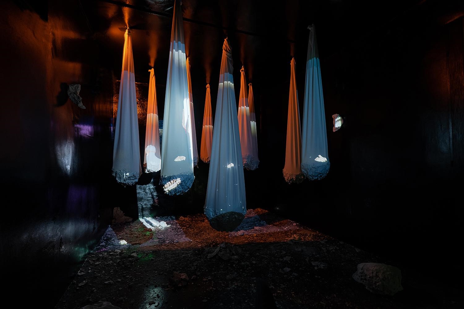 Perdeaua reprezintă spațiul liminal care separă două lumi. Prin acoperirea unei ferestre, perdeaua devine o suprafață care mediază între interior și exterior, între casă și lumea din afara acesteia. O bucată de țesătură este extrasă dintr-o cameră, apoi scoasă în pădure și pătată, înmuiată și târâtă prin noroi, apoi luată înapoi și integrată într-un obiect casnic, cum ar fi o pătură, o perdea, o pătură sau o pilotă. Prin acest proces, pânza este luată dintr-un tărâm familiar și pătrunsă cu istoriile unui loc ciudat, un teritoriu străin care nu seamănă cu intimitatea unei reședințe. Lucrarea analizează practicile domestice efectuate de femei, în special în epoca victoriană, reflectând în totalitate asupra sentimentului de libertate și închisoare în gospodării. Dominată de structuri patriarhale, gospodăria era un spațiu în care femeile se simțeau atât în siguranță, cât și prinse. Au fost surprinși trăgând o perdea și uitându-se pe fereastră uluiți de lumea ciudată care se desfășura dincolo de confortul casei lor, tânjind după o evadare. Pe fundalul închiderilor recente, femeile din întreaga lume au fost din nou împinse să găsească activități eliberatoare în casele lor, în timp ce interacțiunea cu lumea exterioară a avut loc doar prin cadrul ferestrei dormitorului lor.