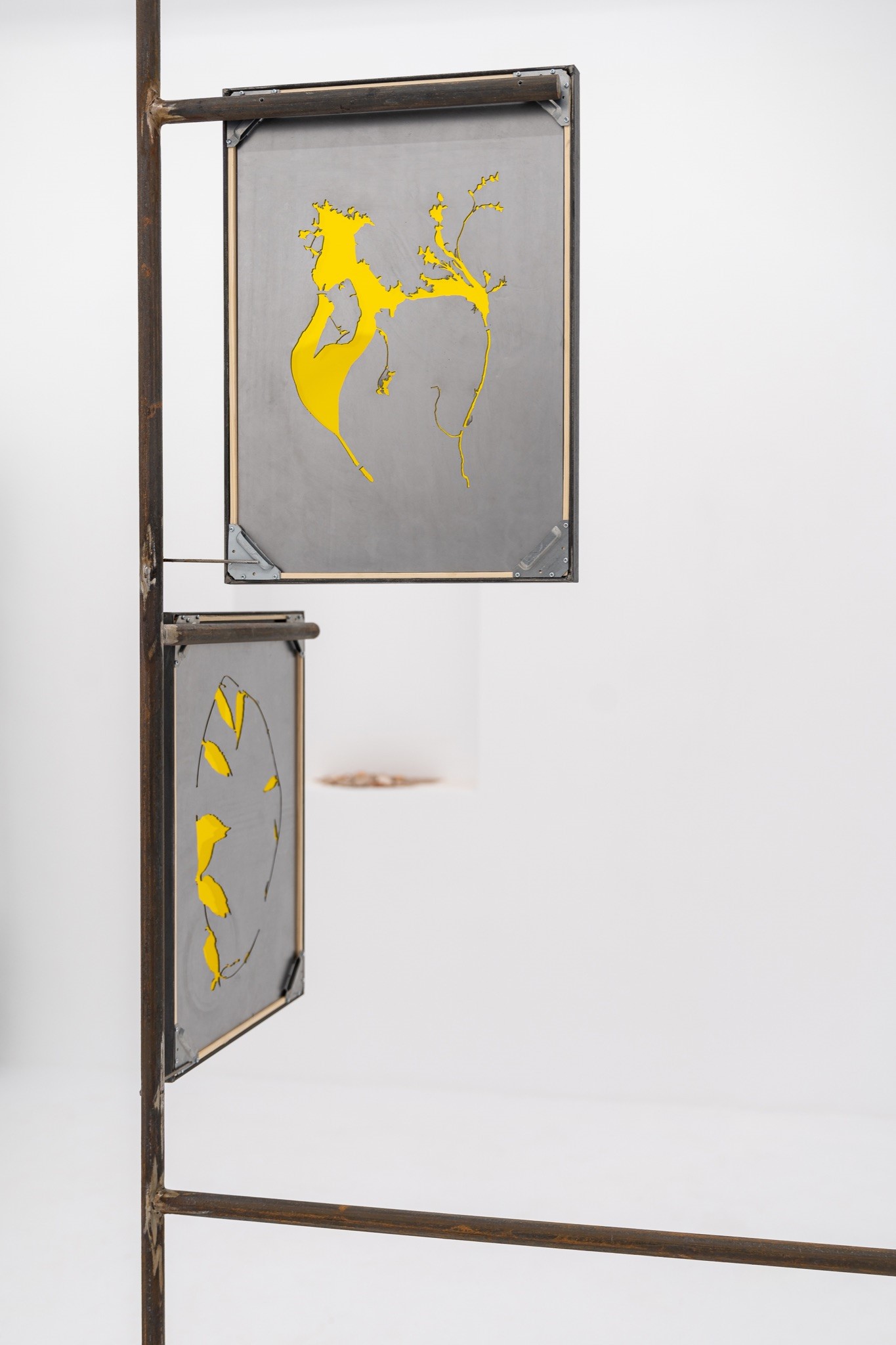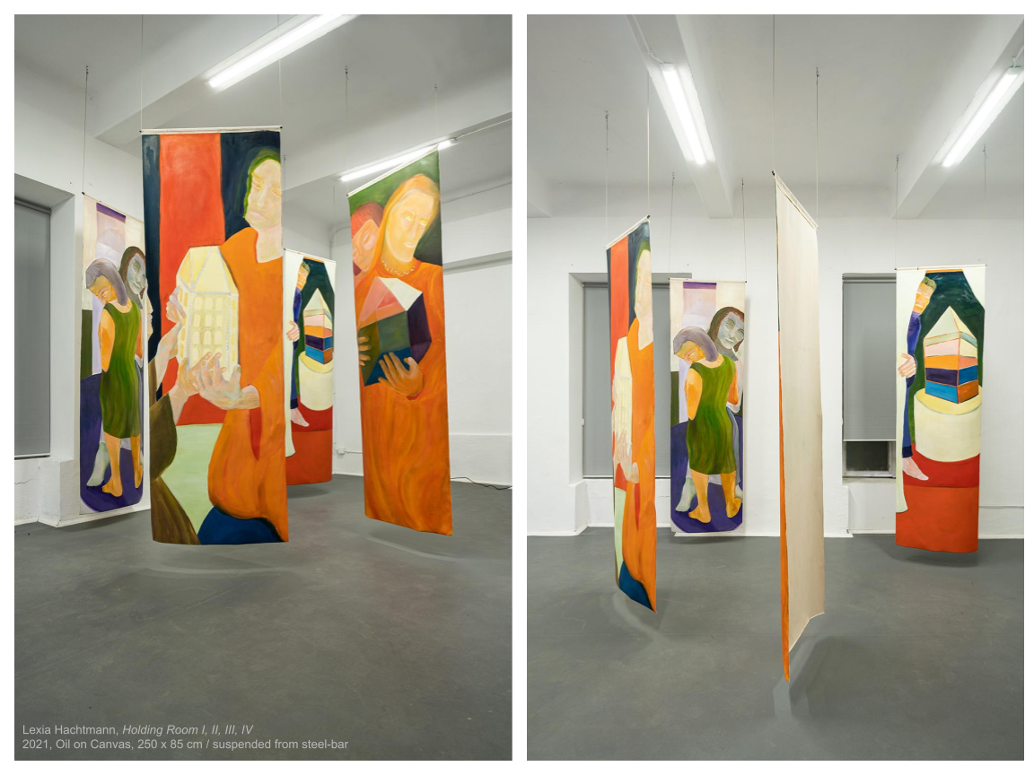 Seria „Holding Room” este compusă din patru tablouri, fiecare suspendată de tavan ca niște perdele, plutind în cameră, chiar deasupra podelei. Cele patru formate lungi și înguste cuprind un spațiu interior în cadrul expoziției prin care spectatorul poate naviga. Picturile tratează ideea unei „case interioare”, un spațiu sacru asupra căruia individul deține controlul. Folosind acest motiv interesant ca punct de plecare pentru lucrare, am urmărit să traduc această imagine religioasă într-un limbaj universal, vizual, care să pună întrebări despre controlul, căminul și accesibilitatea spațiilor, încercând în același timp să construiesc un spațiu universal, subiectiv, incluziv pentru femei în expoziție.
