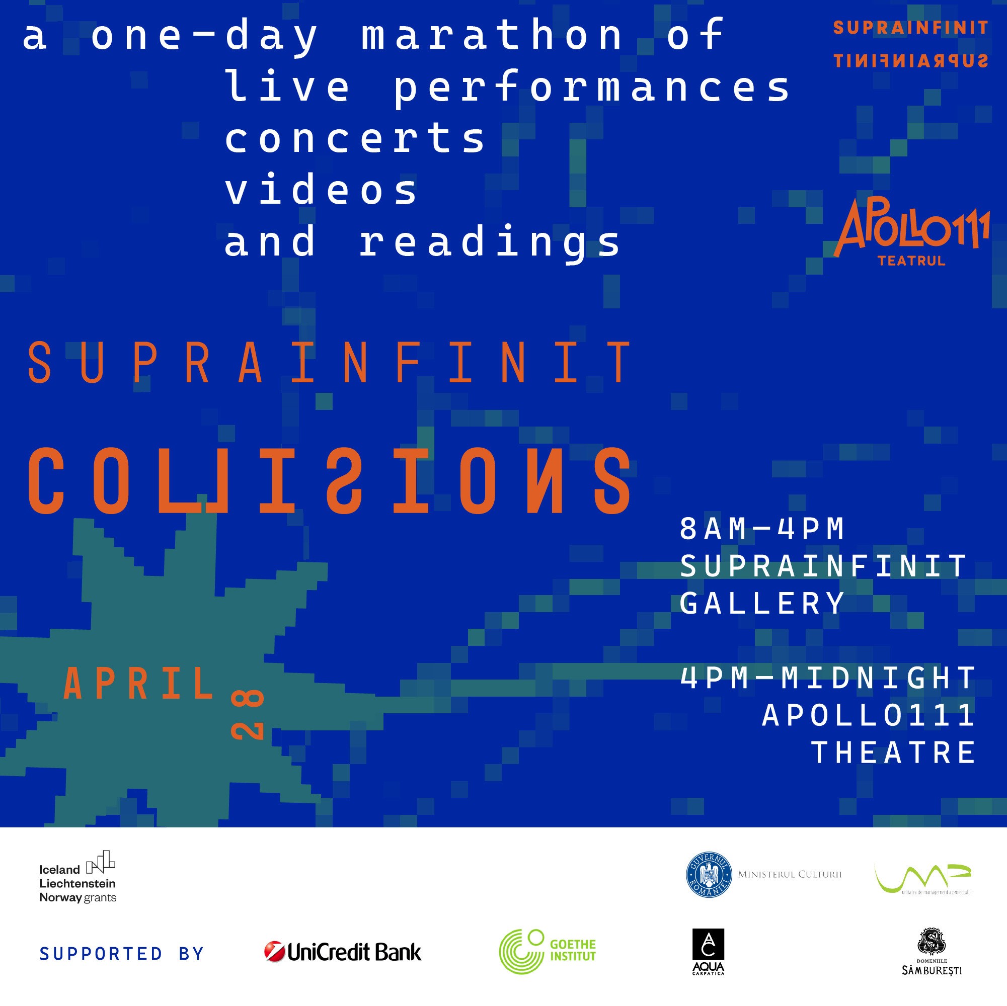 Colaborarea galeriei Suprainfinit cu teatrul Apollo111 a venit în urma dorinței de a lucra pluridisciplinar, în ideea în care o scenă de teatru și un club pot fi gazde pentru un astfel de maraton în care se regăsesc lucrări video, muzică live, dar și cercuri de lectură și dialoguri interdisciplinare.