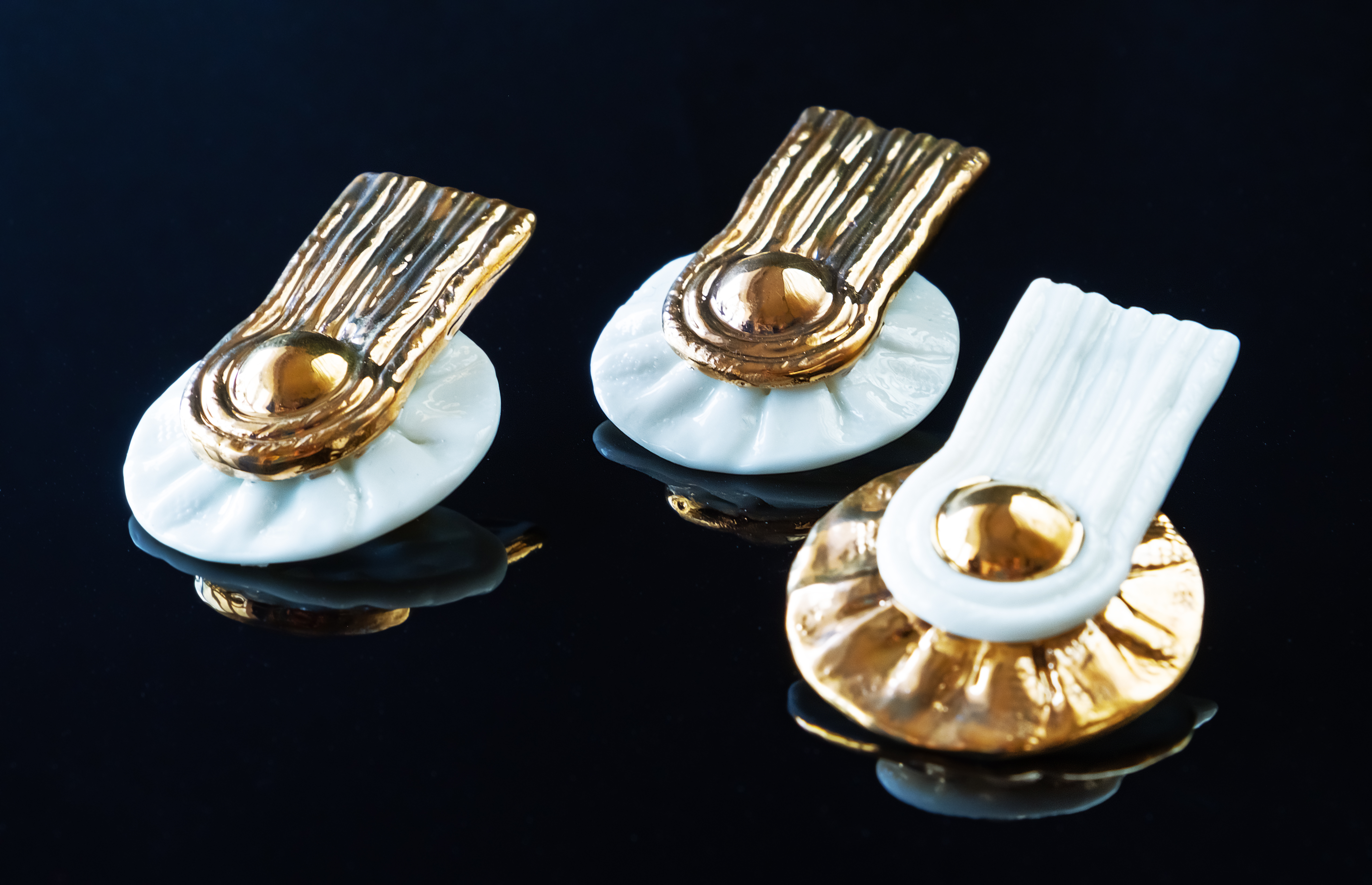 "Obiectul propus este o reinterpretare în porțelan glazurat cu aur coloidal a cocardei din material textil care se află pe căciula Junilor Roșiori. Acesta se poate purta la piept ca o broșă, dar și la reverul unei haine bărbătești.