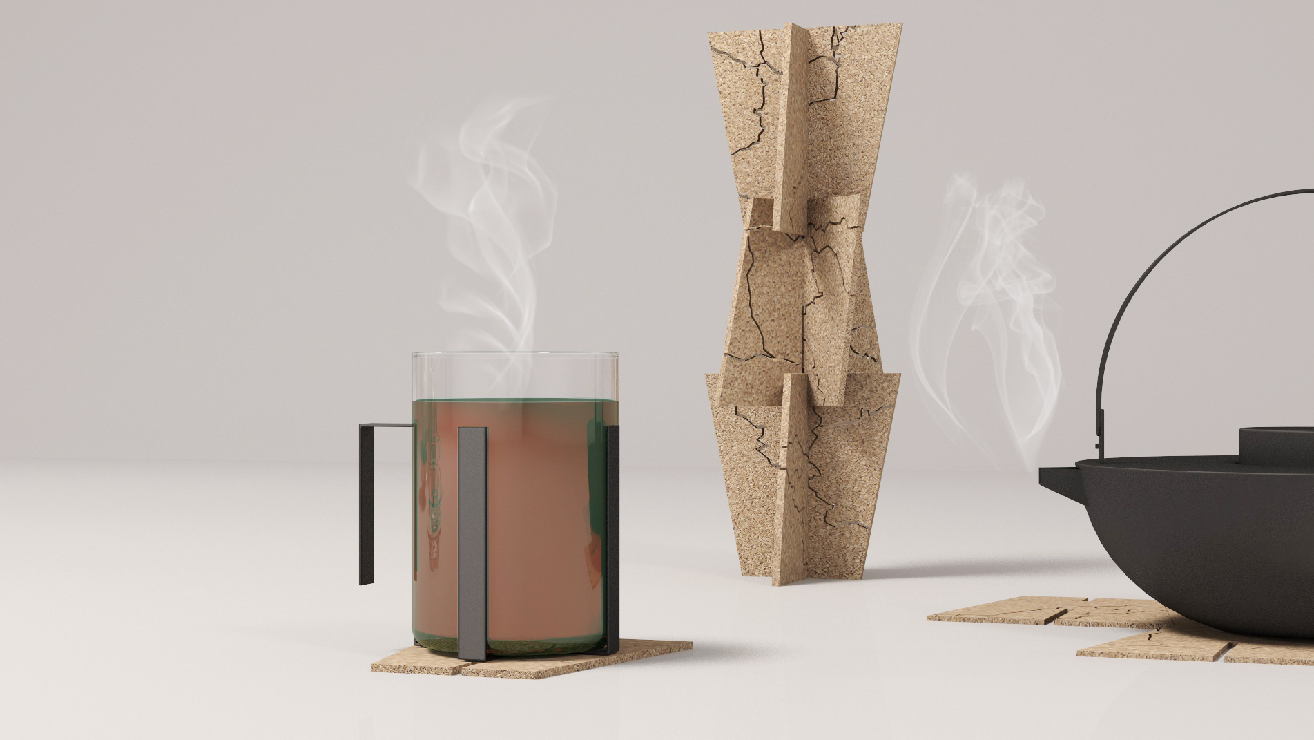 Am dorit să ofer o triplă funcționalitate setului din plută: prima, cea de suport pentru căni calde, format din șase piese individuale - jumătăți de „mărgele”, care îmbinate formează cea de-a doua funcționalitate, și anume, cea de ansamblu decorativ în forma unui segment de Coloană; în final, cea de-a treia funcționalitate, de suport pentru vase calde, se formează prin alăturarea celor 6 elemente.