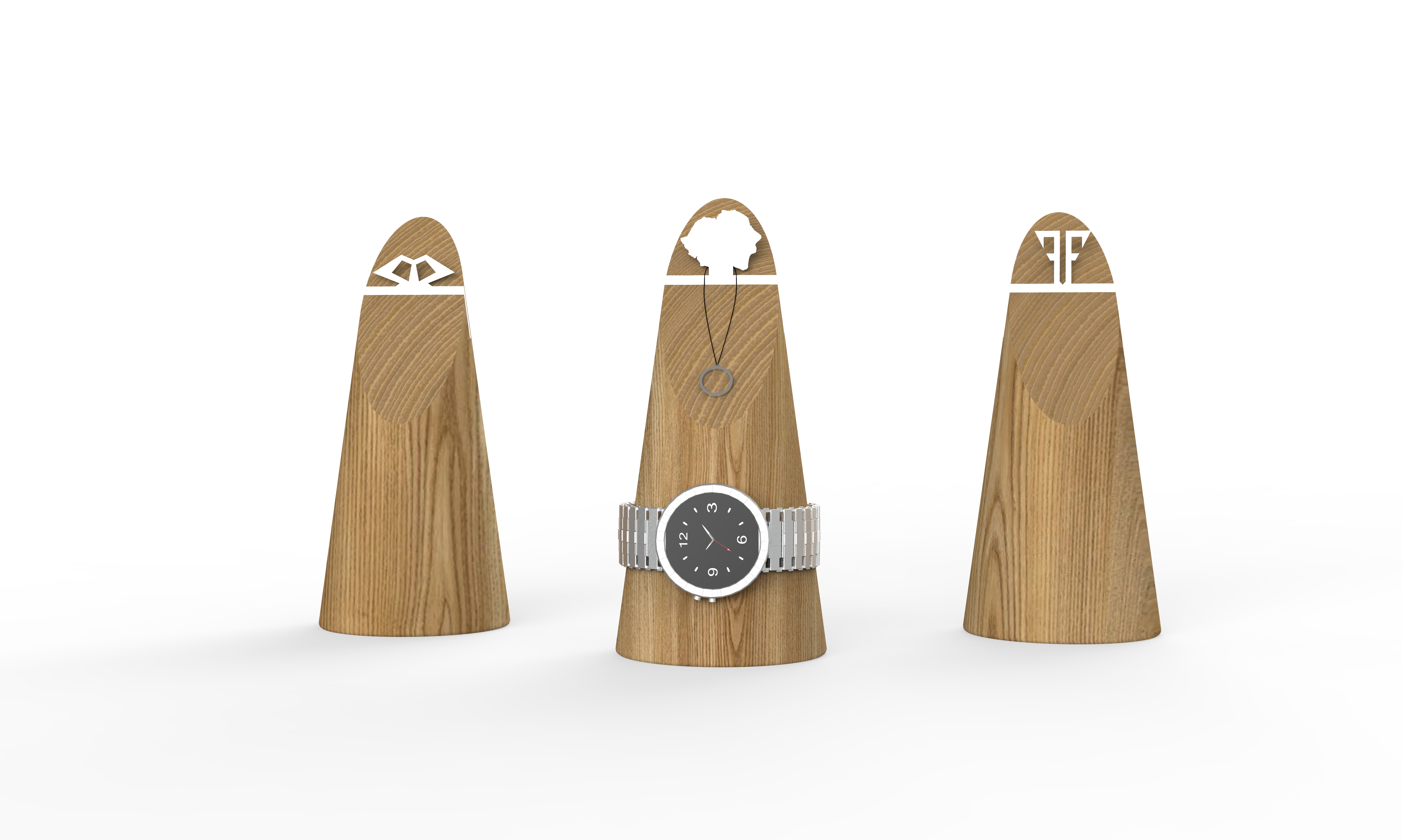 Este alcătuit dintr-un suport de lemn și unul din inox. Am ales să folosesc lemn pentru că este un material nobil, iar frumusețea texturii se poate vedea atât pe lungimea obiectului cât și pe suprafața secționată. Piesa din inox oferă puțin contrast care rupe monotonia din punct de vedere vizual și evidențiază cifrul regal reprezentat.