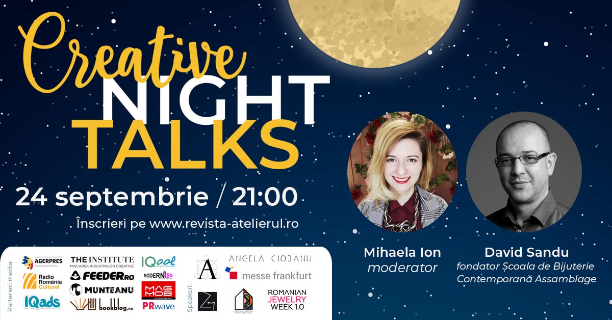 Revista Atelierul continuă în luna septembrie conferințele Creative Night Talks, unde invită specialişti din industriile creative pentru a prezenta statusul evenimentelor și proiectelor pe care le desfășoară. Conferinţele moderate de Mihaela Ion au loc live, online, în fiecare joi seara între orele 21.00 - 22.00 și aduc în atenţia publicului subiecte de actualitate și evenimente de profil în plină desfăşurare.