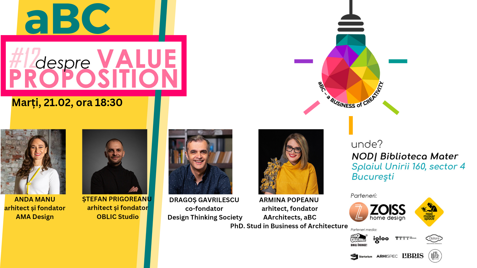 Aflate la a 12a ediție, întâlnirile de business și networking desfășurate sub bagheta aBC – a Business of Creativity Society, revin marți, 21 februarie 2023, de la ora 18:30 la NOD – Biblioteca MATER, pe Splaiul Unirii 160. Singurele întâlniri de antreprenoriat creativ, de arhitectură și design au fost inițiate de Armina Popeanu, arhitect și fondatorul platformei educaționale Antreprenoriat Creativ. Ultima ediție de iarnă este dedicată factorului diferențiator în afacerile creative și a formulării propunerii de valoare și îi are ca invitați pe Ștefan Prigoreanu, arhitect și fondator OBLIC Studio, Anda Manu, arhitect și fondator AMA Design, Dragoș Gavrilescu, co-fondator Design Thinking Society