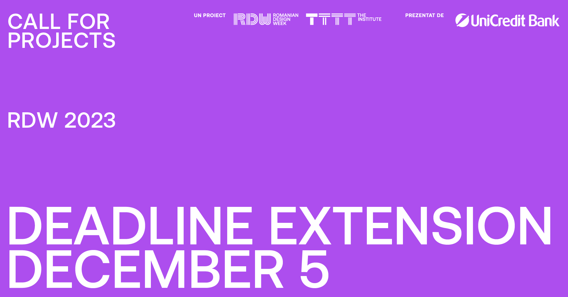 În continuarea misiunii festivalului de a promova profesioniștii industriilor creative prin oferirea unui context în care să-și prezinte proiectele atât către colegii de breaslă, cât și către publicul larg, call-ul de proiecte are două obiective: să adune o bază de selecție pentru expoziția fizică RDW 2023 și să dea startul unei arhive online de bune practici în design și arhitectură, care încurajează lucrările de calitate, ce ajută la o creștere a standardelor pieței și care pot fi luate ca exemple de urmat în anii viitori. Astfel, colecția online de proiecte va deveni un important instrument în promovarea bunelor practici pe tot parcursul anului, nu doar în cele 10 zile de festival.