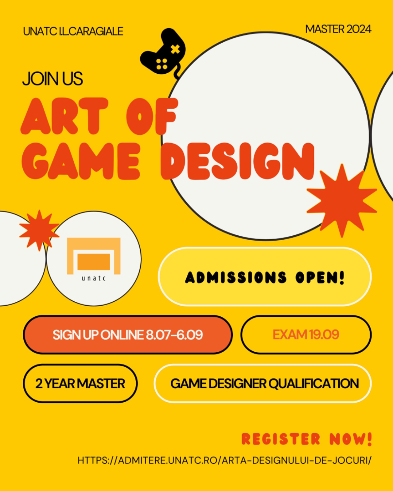 Pentru mai multe informații despre programul de master "Art of Game Design" și despre oportunitățile de înscriere, puteți vizita site-ul oficial al universității, dar și paginile de social media - instagram sau la adresa de e-mail la artofgamedesign@unatc.ro.