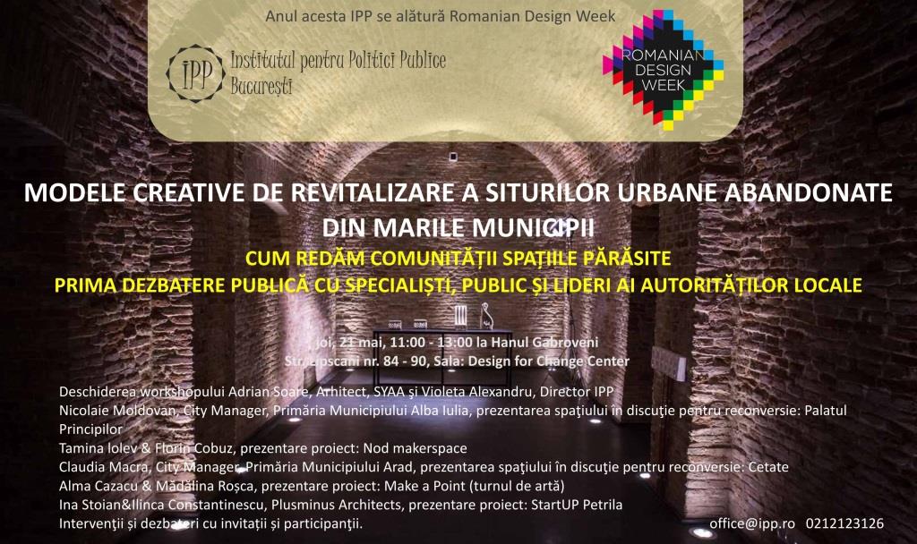 Institutul pentru Politici Publice (IPP) susține joi, 21 mai, de la 11.00, workshop-ul "Modele creative de revitalizare a siturilor urbane în mari municipii", în cadrul Romanian Design Week 2015, la Hanul Gabroveni, str. Lipscani nr. 84-90.