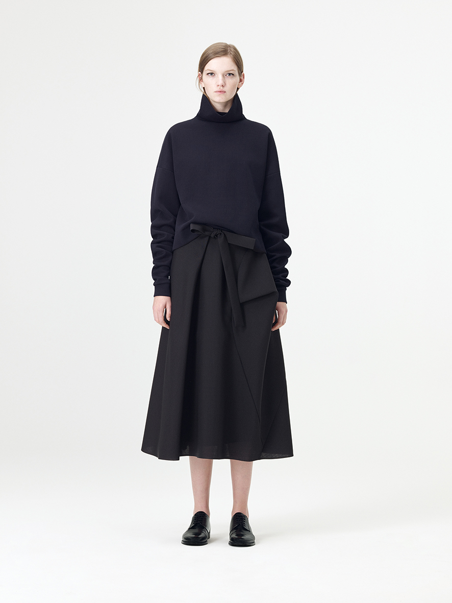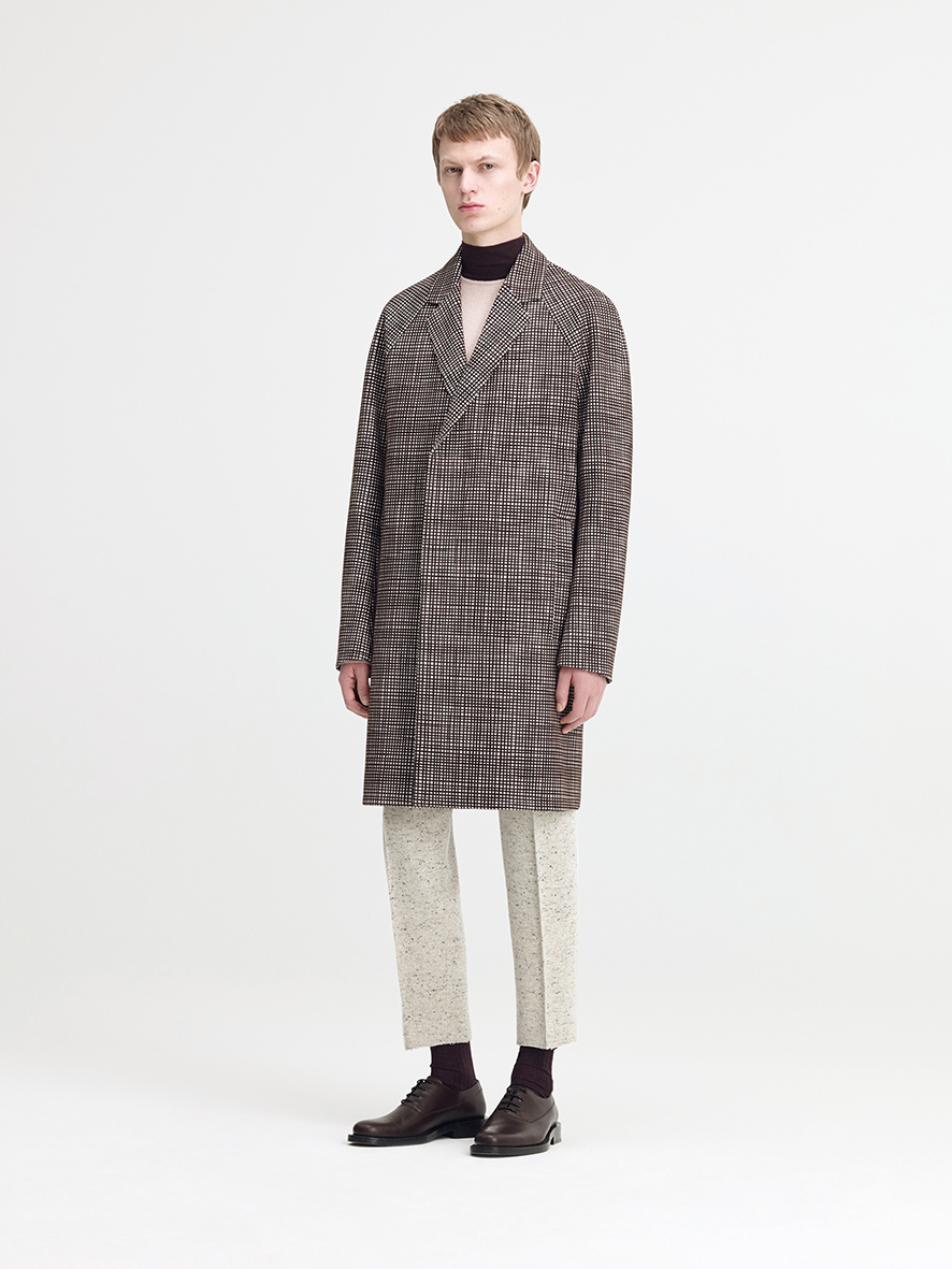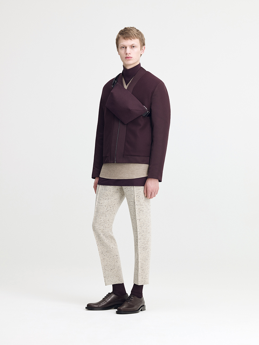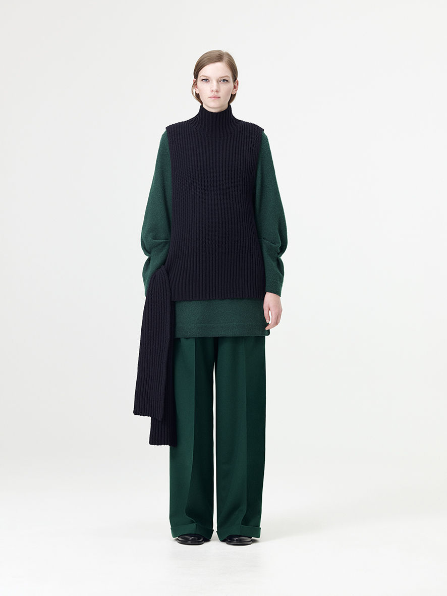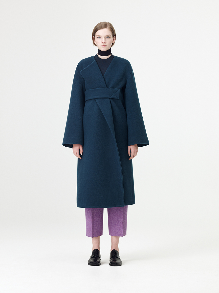 Croiul clasic a fost actualizat pentru a lua forma unei siluete delicate asemenea unui cocon dintr-o lână texturată. Topul gri petrol cu guler înalt este alăturat unor pantaloni decupaţi pentru a forma un look clasic, dar în acelaşi timp modern. Totul va fi completat de un palton din lână texturată într-un albastru navy cu umeri delicaţi.