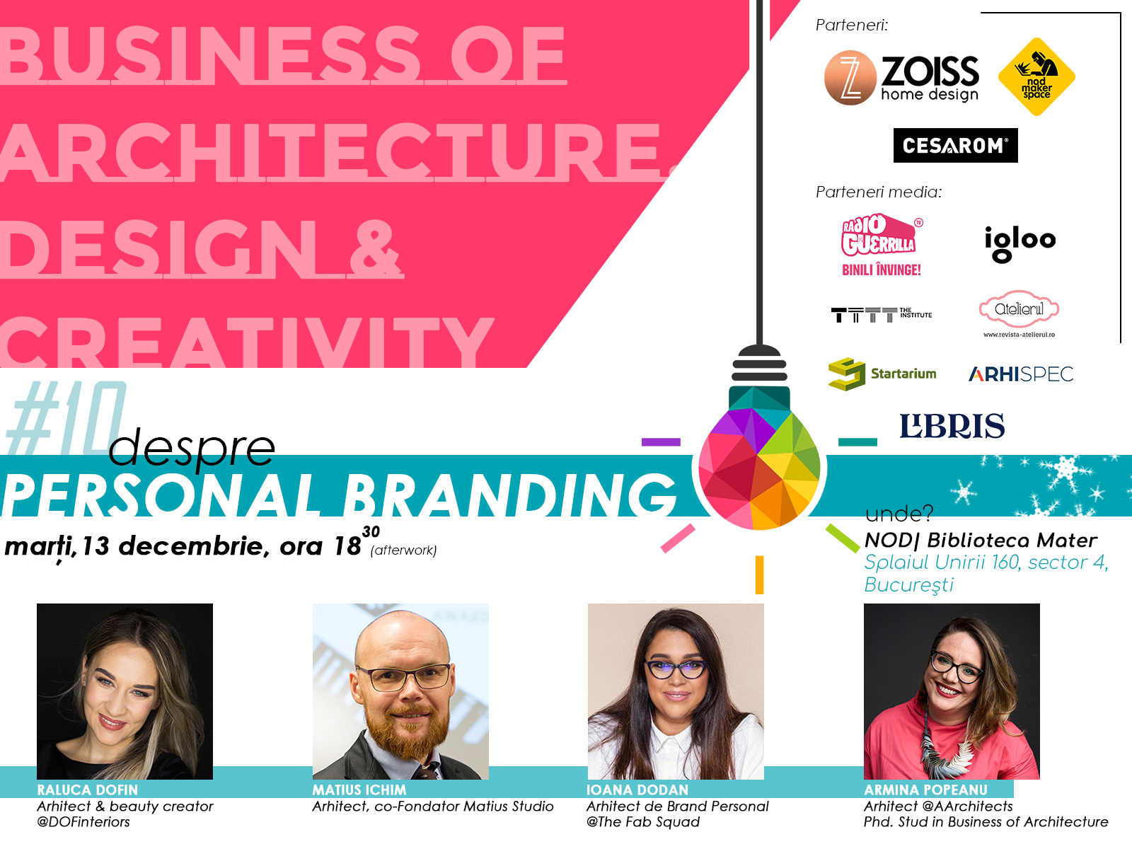 Ajunse la a 10a ediție și ultima întâlnire din 2022 din seria întâlnirilor lunare dedicate business-urilor creative inițiată de Armina Popeanu – a Business of Creativity are loc marți, 13 decembrie, la NOD cu o conversație despre promovare și personal branding cu Ioana Dodan – arhitect de brand personal, Ralu Dofin – arhitect specializat în interior și Matius Ichim – arhitect și antreprenor.