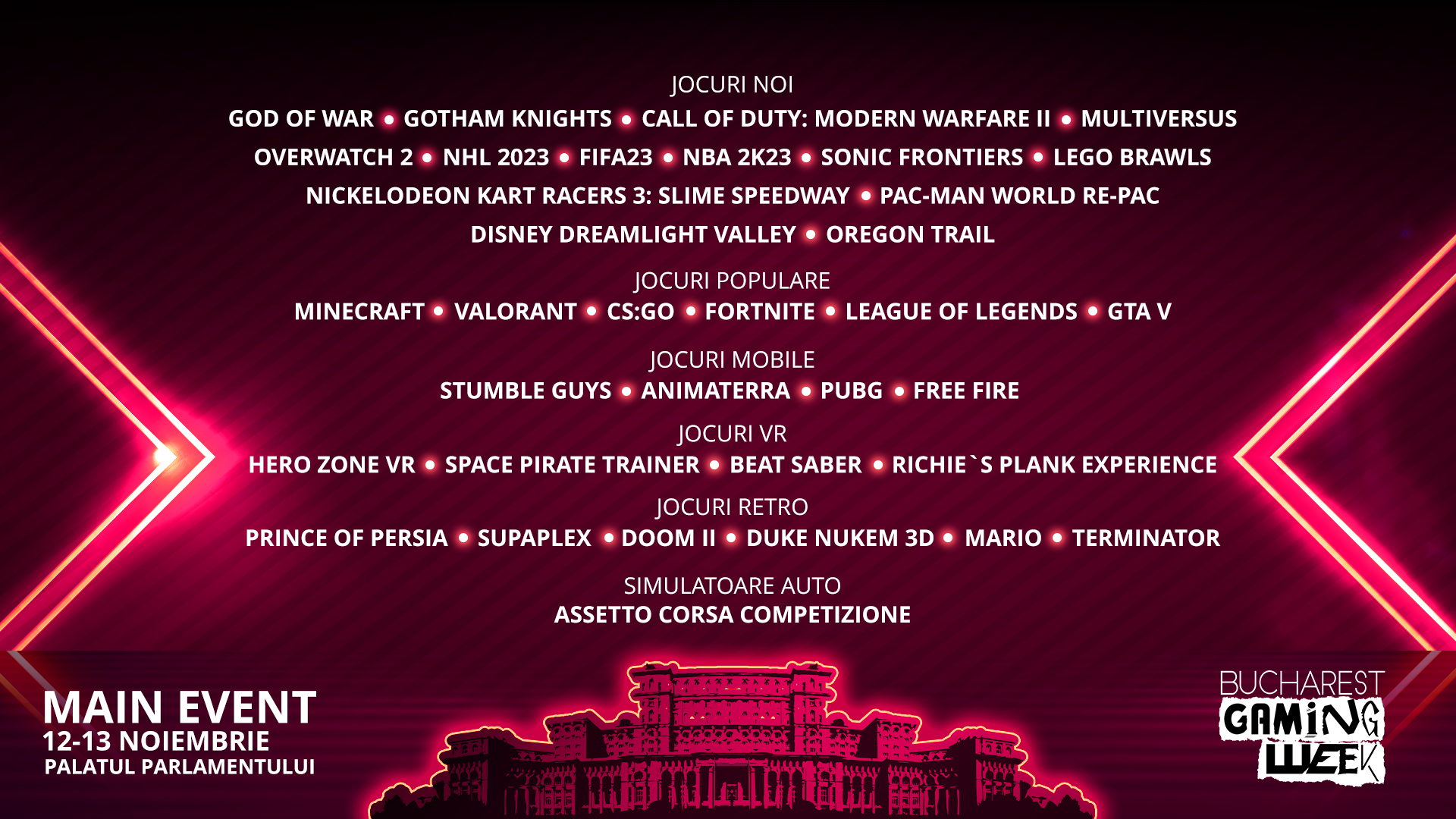 Evenimentul central al celei de-a șasea ediții a Bucharest Gaming Week se întoarce la Palatul Parlamentului, pe 12 și 13 noiembrie. În cele două zile de weekend, gamerii se vor juca, alături de cei mai populari streameri de gaming, cele mai noi, populare și retro jocuri video.Noile titluri își vor face apariția pe consolele de gaming de la Palatul Parlamentului iar participanții vor avea șansa să experimenteze God of War Ragnarök, Call Of Duty:Modern Warfare 2 sau FIFA 23, printre multe altele.