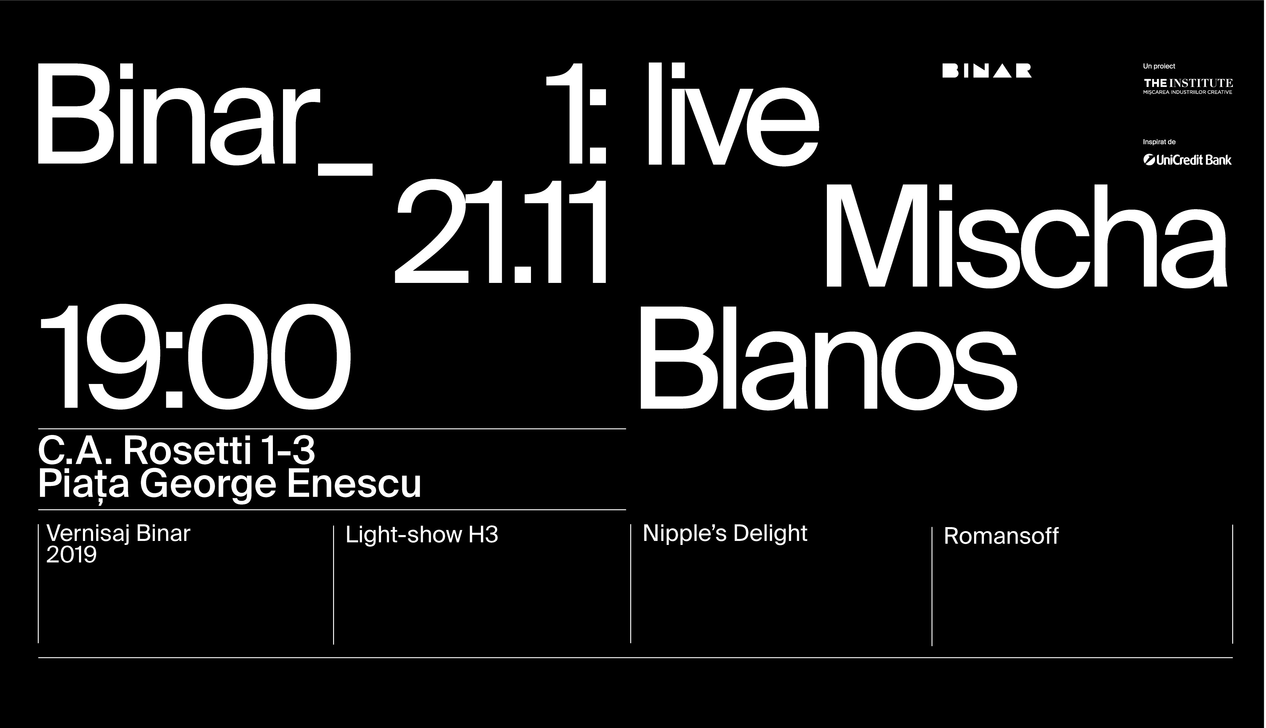 Joi, 21 noiembrie, începând cu ora 19:00, în clădirea monument istoric care a adăpostit fostul restaurant Cina, Strada C.A. Rosetti 1-3, în Cartierul Creativ, are loc vernisajul expoziției BINAR, un proiect inițiat de The Institute și inspirat de UniCredit Bank. Seara continuă, de la ora 21:00, cu un live act susținut de Mischa Blanos urmat de un DJ set pregătit de Nipple’s Delight & Romansoff. Performance-ul muzical va fi completat de un interactive light show realizat de studioul de creație H3. Intrarea este liberă.