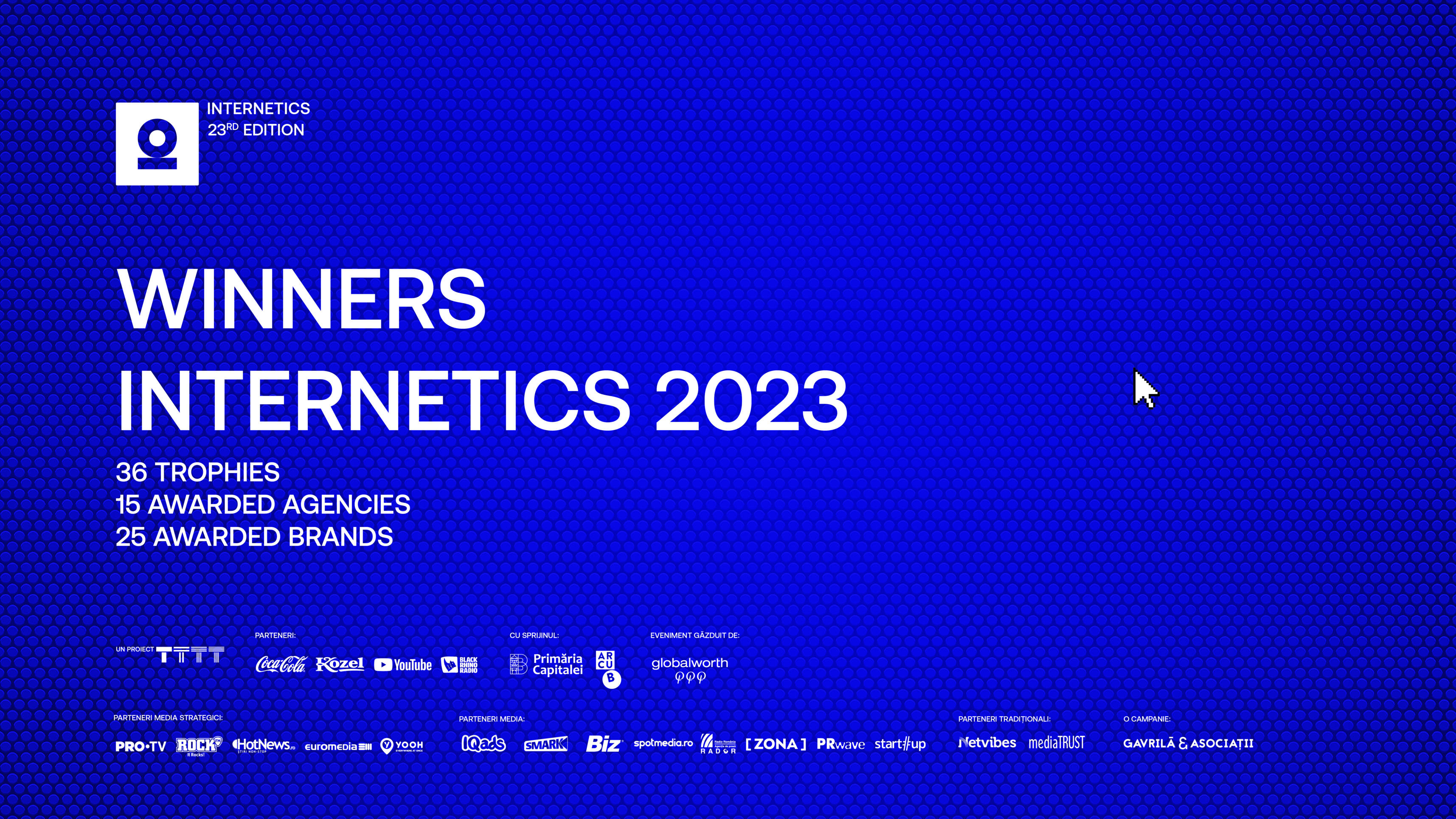 Internetics și-a desemnat câștigătorii în cadrul Galei de Premiere Internetics 2023, ieri, 28 noiembrie, la NORD Events Center by Globalworth. În cadrul evenimentului au fost oferite 36 de trofee, dintre care 15 trofee Gold și 21 Silver. Publicis România devine Agenția Anului, cu 6 trofee obținute și o nominalizare, în timp ce Digital Client of the YEAR este OLX ONLINE SERVICES, cu 4 trofee obținute, în total: 3 Gold și 1 Silver. Festivalul premiază în fiecare an inteligența digitală și excelența în comunicarea online, fiind un proiect inițiat de The Institute.