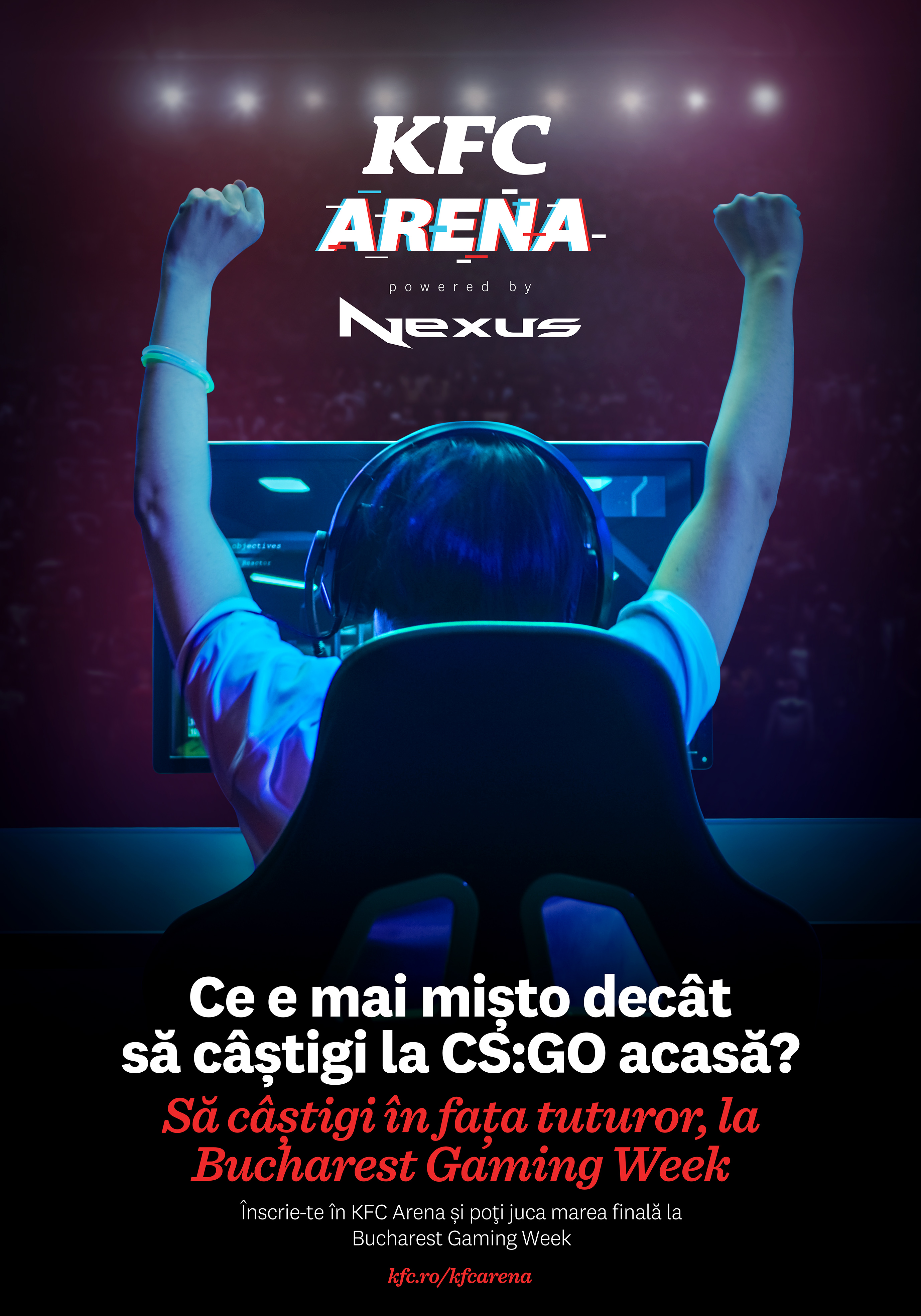De-a lungul timpului, KFC România s-a remarcat în zona de food service nu doar prin produse și servicii de calitate, recunoscute la nivel internațional, dar și prin inovațiile pe care le-a lansat în plan local, relevante pentru publicul său țintă. Anul acesta, KFC alege să susțină comunitatea de gaming din România și, în parteneriat cu Nexus Gaming și Bucharest Gaming Week (BGW) organizează o competiție națională de CS:GO (Counter Strike – Global Offensive). Aceasta va reuni, sub conceptul KFC Arena powered by Nexus, echipele non-pro din România care vor avea șansa să obțină un loc în finala Bucharest Gaming Week și oportunitatea de a câștiga unul din premiile puse la bătaie, în valoare totală de 5.000 de euro. Fanii jocului video CS vor avea ocazia să se remarce într-un context deosebit, anul acesta împlinindu-se 20 de ani de la apariția primei variante CS pe piață.